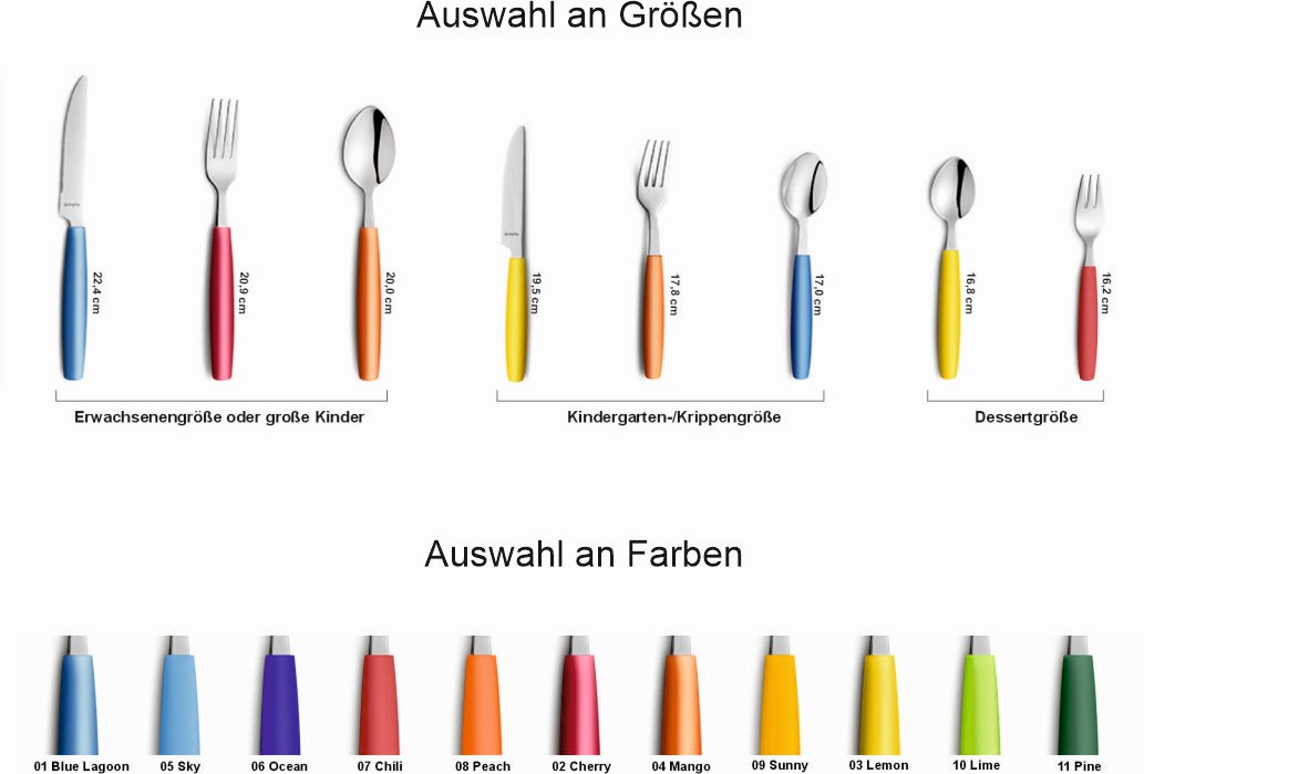 - Das größere Besteck (zusätzlich mit Tee-/Kaffeelöffel und Kuchengabel) eignet sich hervorragend für größere Kindergartenkinder oder das pädagogische Personal.