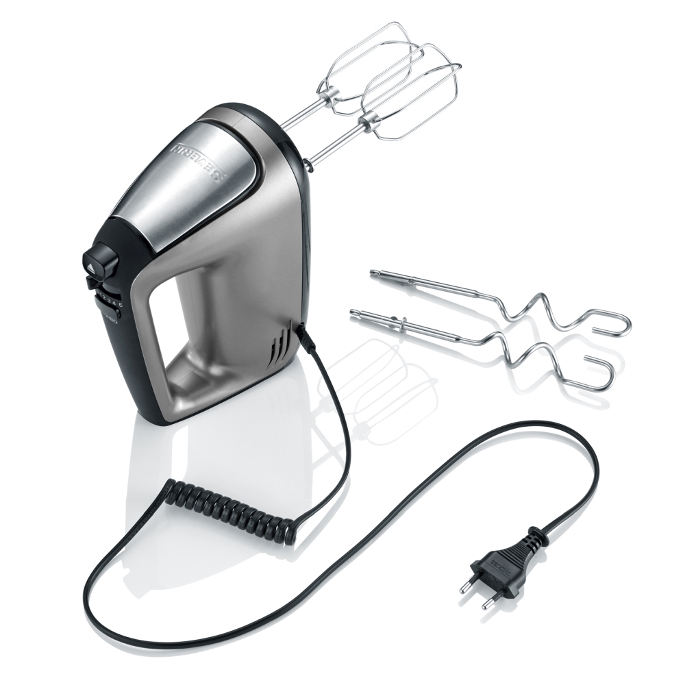 Für volle Flexibilität: Das Spiralkabel ermöglicht freies Arbeiten, während die zwei Rührbesen und zwei Knethaken aus Edelstahl zuverlässig für luftig-leichte oder kräftige Ergebnisse sorgen.