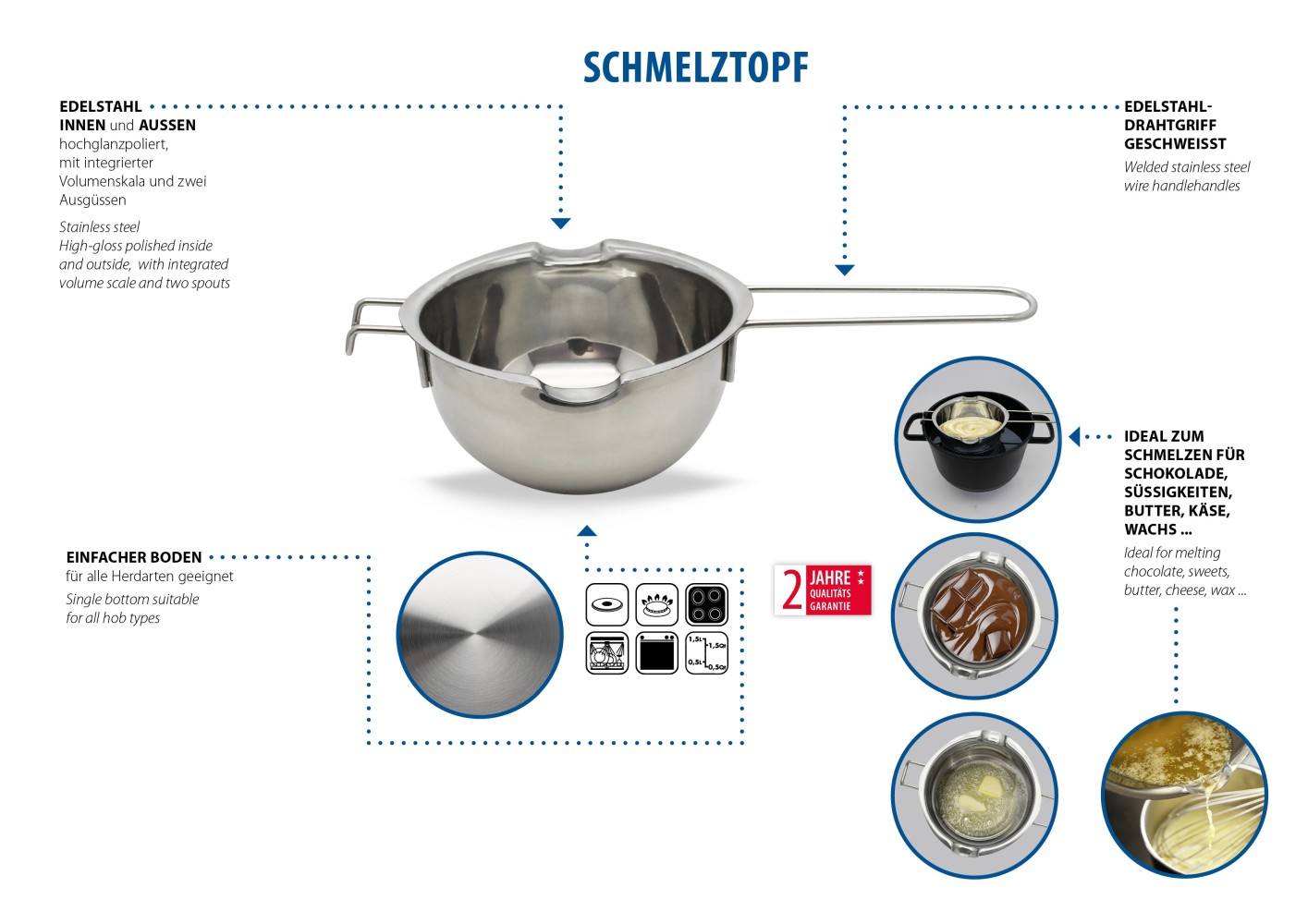 Der Schmelztopf von ELO ist der ideale Helfer zum Schmelzen von Butter, Käse, Schokolade oder Wachs. Mit der integrierten Volumenskale und den zwei Ausgießern ist ein präzises und komfortables Dosieren und Ausgießen möglich, Passend für Rechts- sowie Linkshänder.
