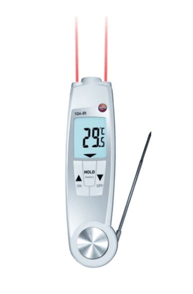 Das Einstech-Infrarot-Thermometer testo 104-IR können Sie ideal für die Temperaturkontrolle von Lebensmitteln einsetzen. Kompakt in der Jackentasche verstaut, ist es am Wareneingang, bei Transporten oder dem Kontrollgang im Einzelhandel immer mit dabei und sofort griffbereit.