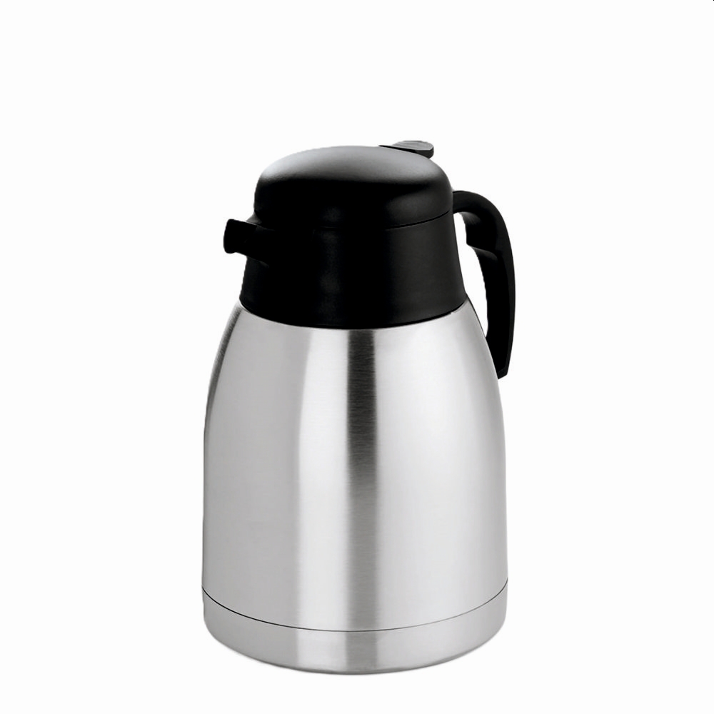 Erhältlich mit 1, 1,5 oder 2 Litern Inhalt, passt sie sich flexibel dem Bedarf an. Der Korpus aus rostfreiem Edelstahl (Chromnickelstahl Cr Ni 18/8–18/10) steht für Langlebigkeit, Hygiene und gute Isoliereigenschaften. Oberteil und Griff aus Kunststoff ermöglichen eine sichere und angenehme Handhabung.