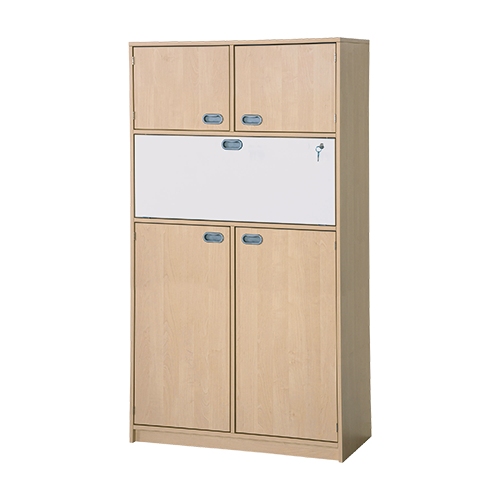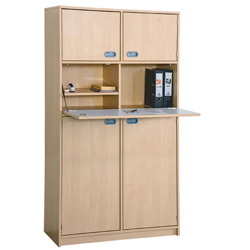Wenn sie gebraucht wird, ist die Klappe schnell geöffnet und so wird ein kleiner Steharbeitsplatz im Gruppenraum geschaffen. Darunter und darüber lassen sich Ordner und allerlei andere Unterlagen verstauen. Die Klappe ist verschließbar, damit die wichtigsten Dinge und Persönliches vor unbefugtem Zugriff geschützt sind.