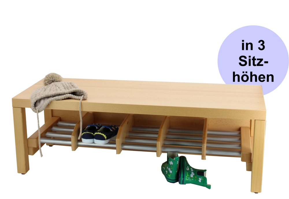 Bitte beachten Sie, dass bei Sitzhöhe 26 cm kaum Platz unter der Schuhablage bleibt! Während Sie bei Sitzhöhe 34 cm und erst recht bei Sitzhöhe 42 cm noch Dinge unter die Schuhablage stellen können, passt bei Sitzhöhe 26 cm kaum noch etwas sinnvoll unter die Schuhablage, sodass es evtl. sogar besser ist, nur die Bank zu wählen ohne Schubablage (falls gewünscht, navigieren Sie eine Ebene nach oben), denn es kann auch passieren, dass bei Sitzhöhe 26 cm Stiefel nicht mehr zwischen Schuhablage und Unterseite der Sitzfläche passen. Machen Sie die Wahl der Sitzhöhe aber auf keinen Fall davon abhängig, ob noch etwas unter bzw. auf die Schuhablage passt oder nicht, sondern wählen Sie die Sitzhöhe der Bank ausschließlich in Bezug auf die Körpergröße der Kinder.