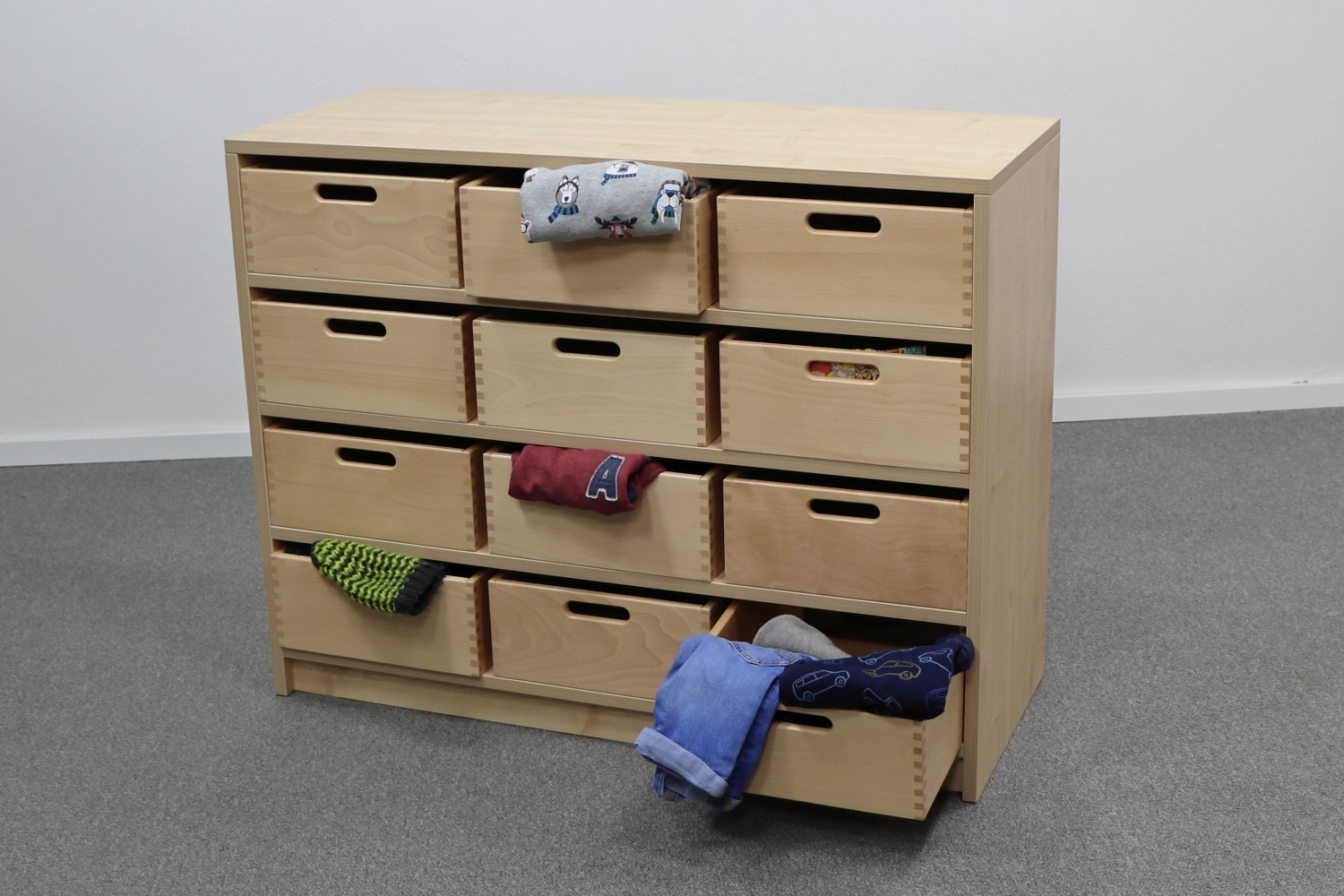 Korpusschrank Ahorn Honig mit 12 großen Materialkästen, B/H/T 102 x 80 x 40 cm, ohne Sichtfenster, ohne Filz