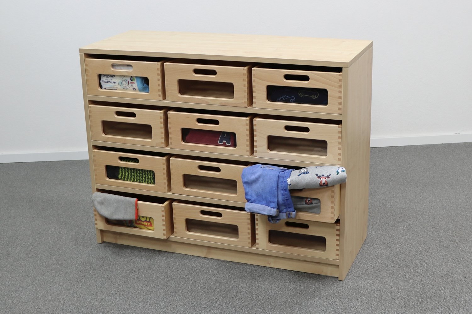 Korpusschrank Ahorn Honig mit 12 großen Materialkästen, B/H/T 102 x 80 x 40 cm, mit Sichtfenster, ohne Filz