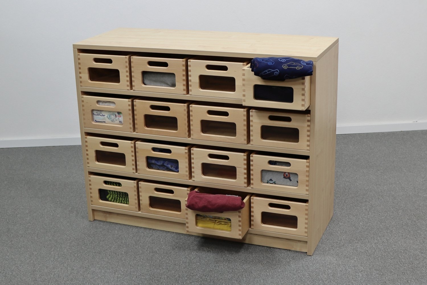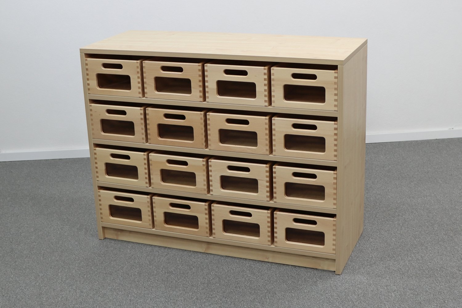 Korpusschrank Ahorn Honig mit 16 mittleren Materialkästen, B/H/T 102 x 80 x 40 cm, mit Sichtfenster, ohne Filz