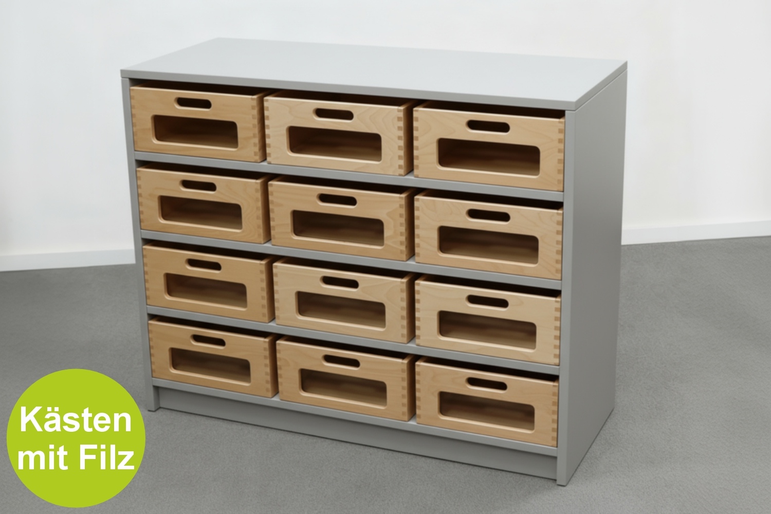 Korpusschrank Grau mit 12 großen Materialkästen, B/H/T 102 x 80 x 40 cm, mit Sichtfenster, mit Filz
