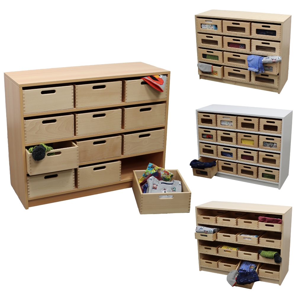 Der stabile Korpus (19mm) aus melaminharzbeschichteter E1-Spanplatte steht sicher auf einem Sockel und ist pflegeleicht im täglichen Gebrauch. Die Materialkästen aus massiver Buche, wahlweise mit Sichtfenster und/oder Schonboden aus Filz, bringen Übersicht und natürliche Wärme in den Raum.