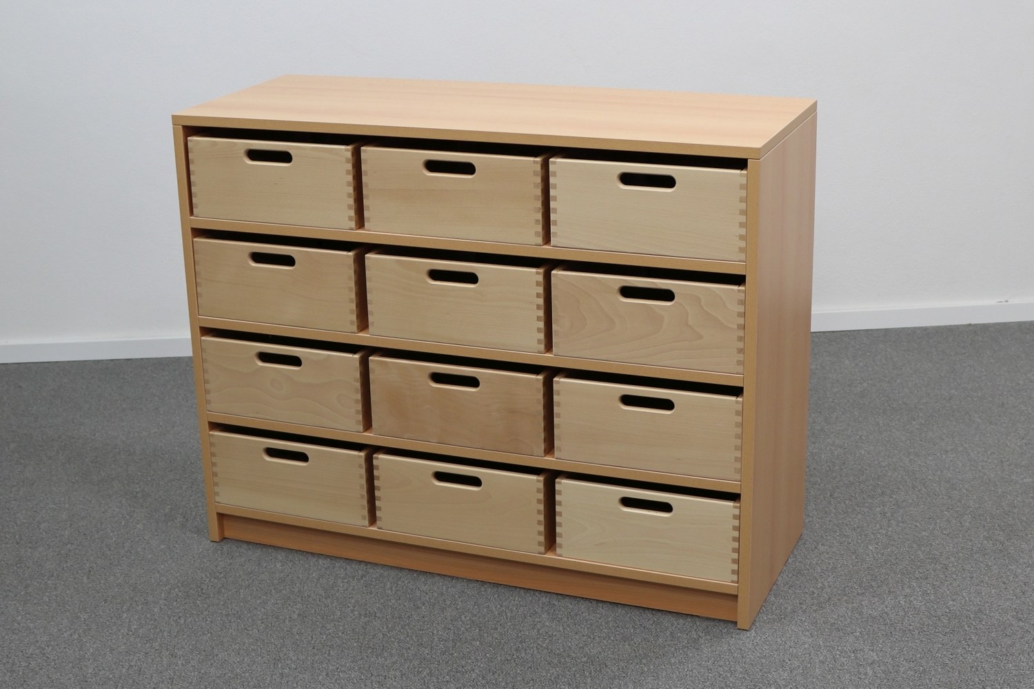 Korpusschrank Buche mit 12 großen Materialkästen, B/H/T 102 x 80 x 40 cm, ohne Sichtfenster, ohne Filz