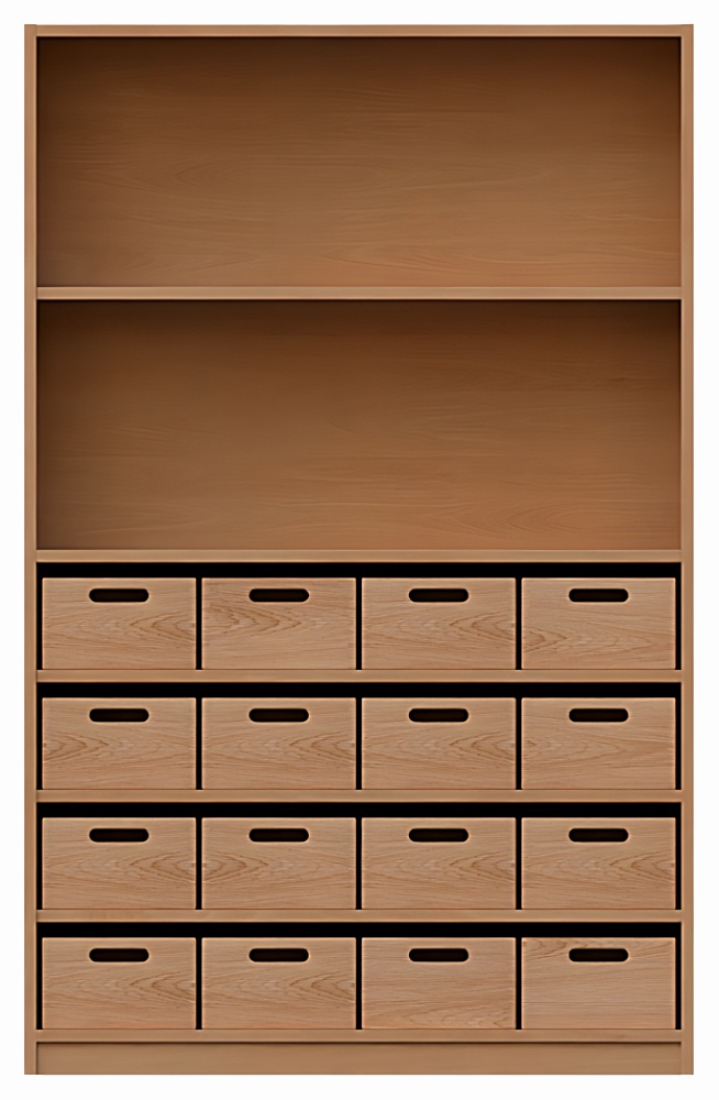Unten: 3 Einlegeböden und 16 Holzkästen