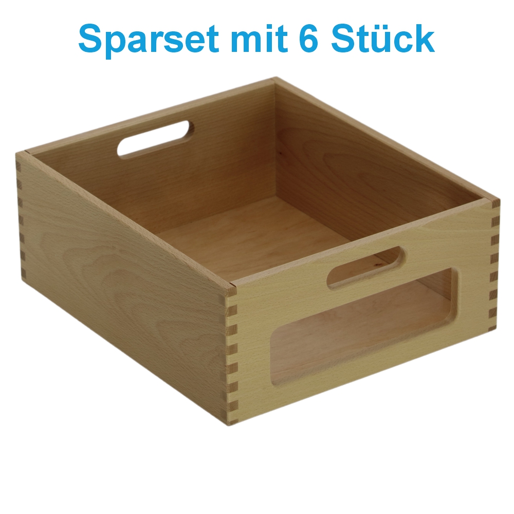 Materialkasten aus Buche Massivholz, Größe "groß", ohne Filzschonboden, mit Sichtfenster im Sparset mit 6 Stück