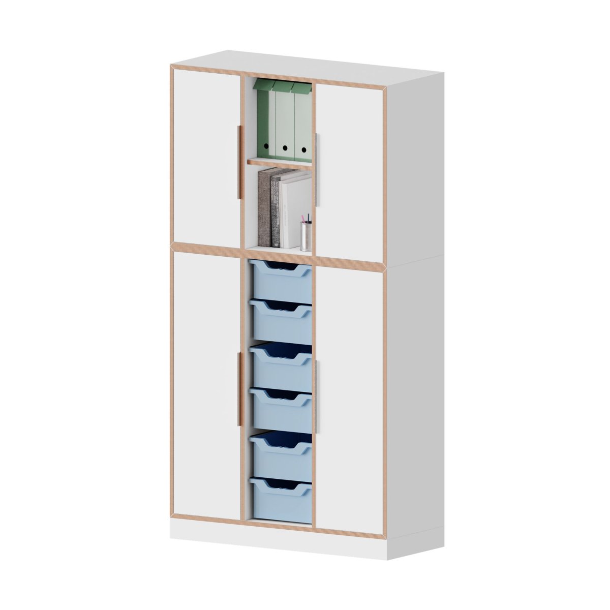 Der Schrank glänzt durch viel Stauraum und Mobilität, wodurch er sowohl in Kitas, Schulen als auch in Büros seinen Platz findet. Er besteht aus einem Schrank mit 3 Ordnerhöhen und einem zusätzlichen Aufsatzschrank mit 2 Ordnerhöhen. Er beinhaltet zusätzlich 6 große Ergo Tray Boxen in denen all deine Unterlagen organisiert ihren Platz finden. Außerdem ist das Schranksystem jederzeit problemlos erweiterbar.