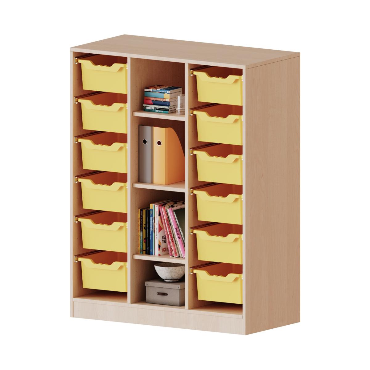 Breite 104,5 cm, Gesamthöhe 136 cm, mit Sockel, rechts und links je 6 hohe ErgoTray Boxen, 4 Fächer in der Mitte