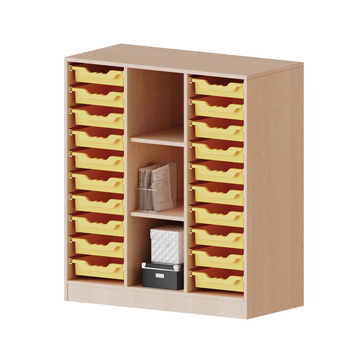 Breite 104,5 cm, Gesamthöhe 118 cm, mit Sockel, rechts und links je 10 flache ErgoTray Boxen, 3 Fächer in der Mitte