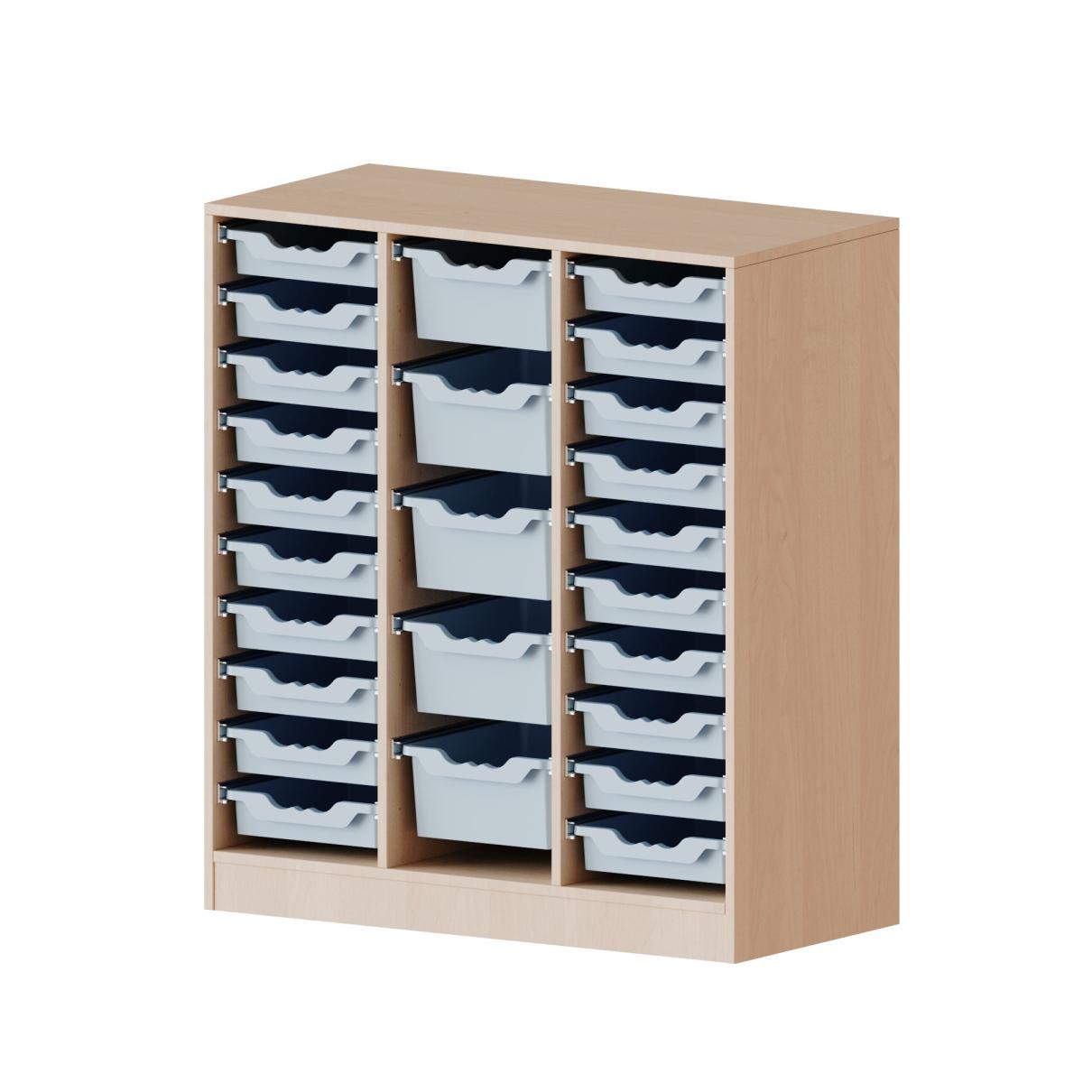 Breite 104,5 cm, Gesamthöhe 118 cm, mit Sockel, rechts und links je 10 flache, in der Mitte 5 hohe ErgoTray Boxen