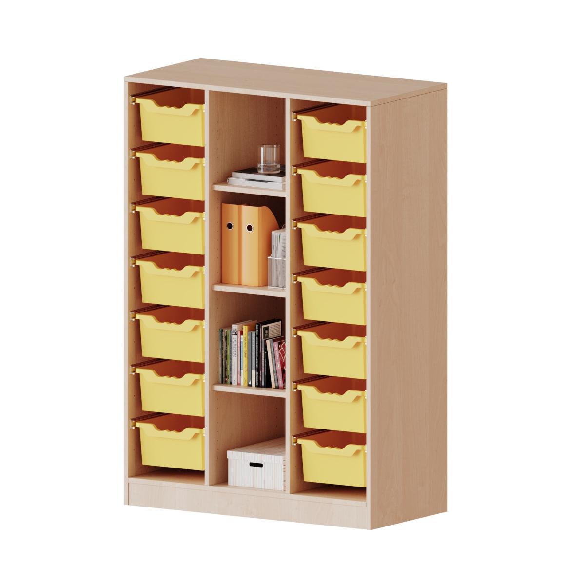 Breite 104,5 cm, Gesamthöhe 154 cm, mit Sockel, rechts und links je 7 hohe ErgoTray Boxen, 4 Fächer in der Mitte