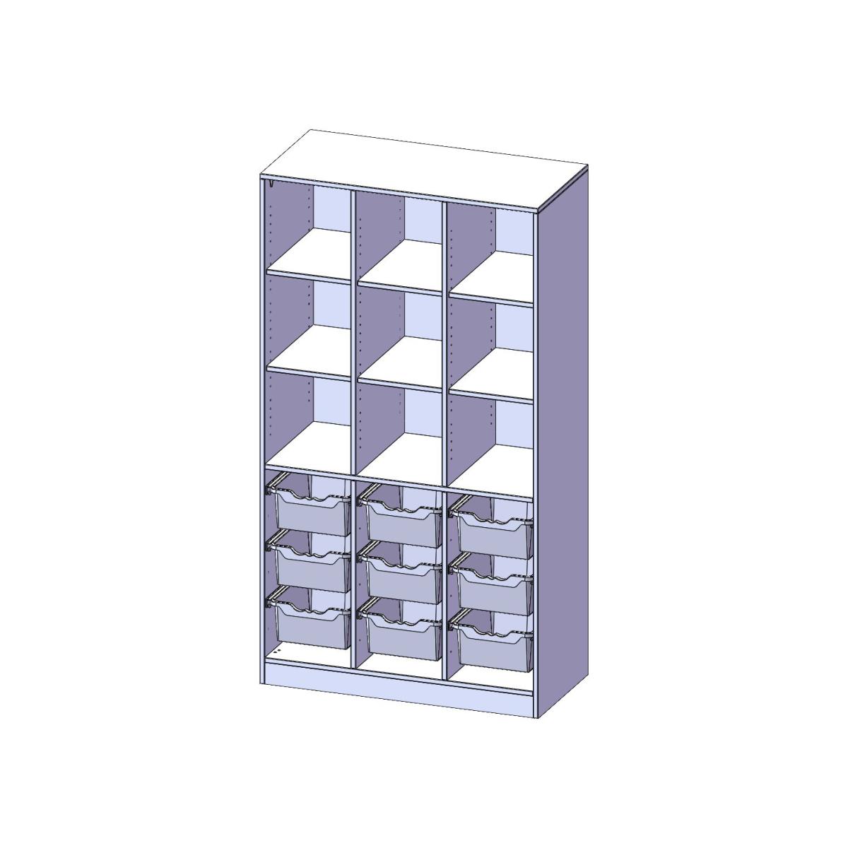 mit Sockel und Mittelwand, unten 9 hohe ErgoTray Boxen, oben 6 Einlegeböden, B/H/T: 104,5x190x50 cm