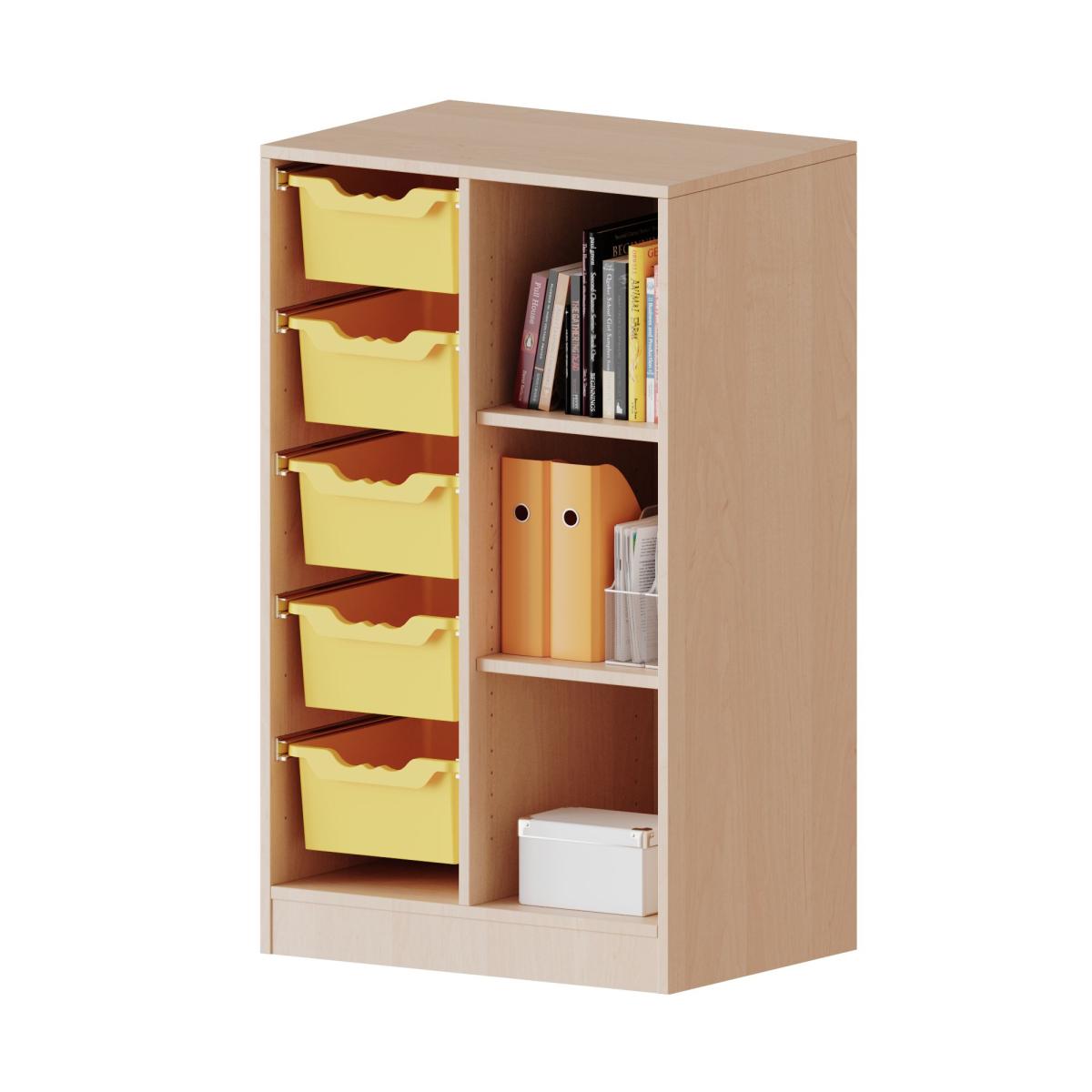 Breite 70,3 cm, Gesamthöhe 118 cm, mit Sockel, rechts 3 Fächer, links 5 hohe ErgoTray Boxen