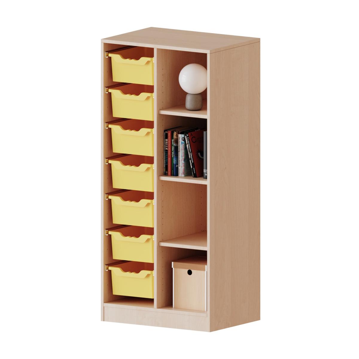 Breite 70,3 cm, Gesamthöhe 154 cm, mit Sockel, rechts 4 Fächer, links 7 hohe ErgoTray Boxen