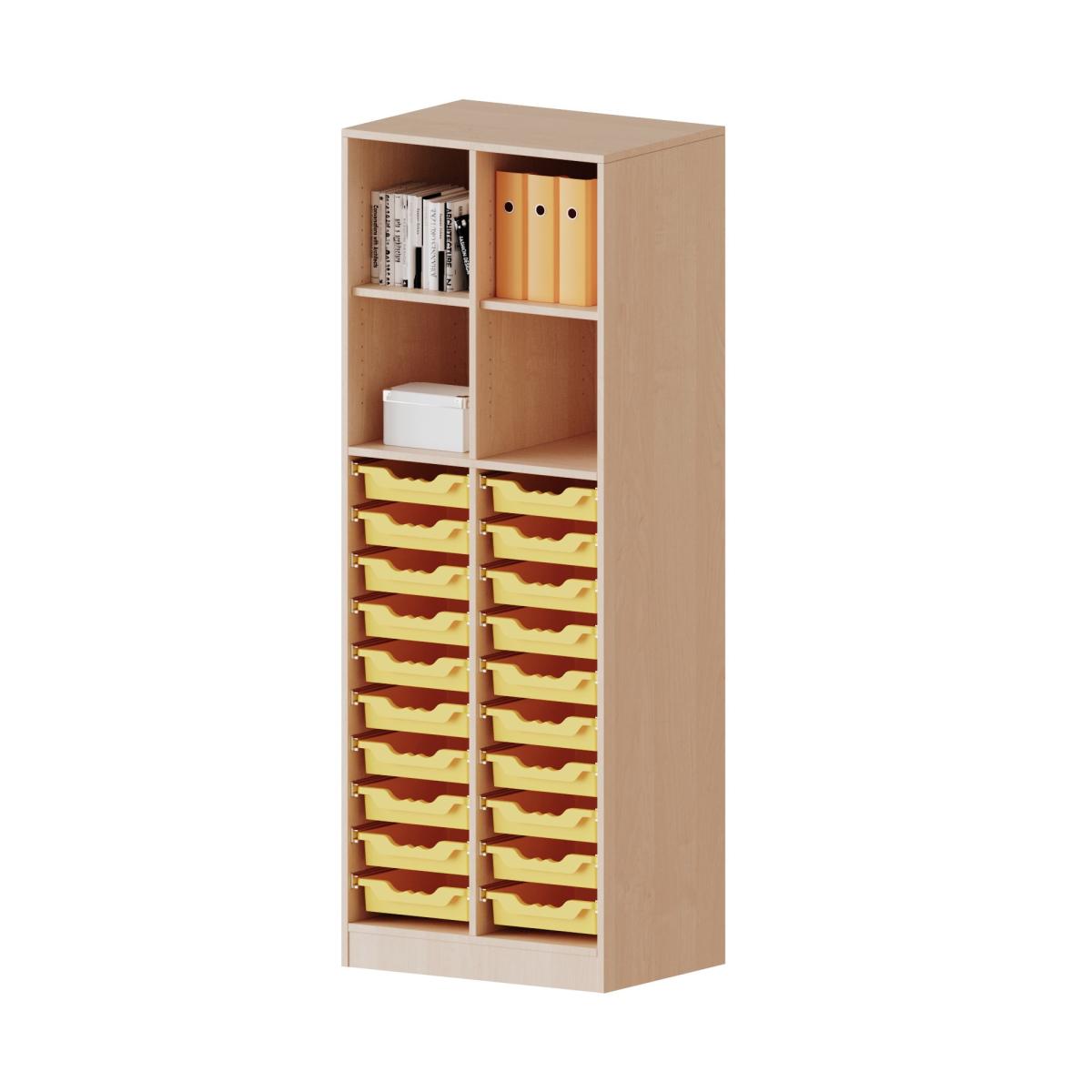 Breite 70,3 cm, Gesamthöhe 190 cm, mit Sockel und Mittelwand, unten 20 flache ErgoTray Boxen, oben 4 Einlegeböden