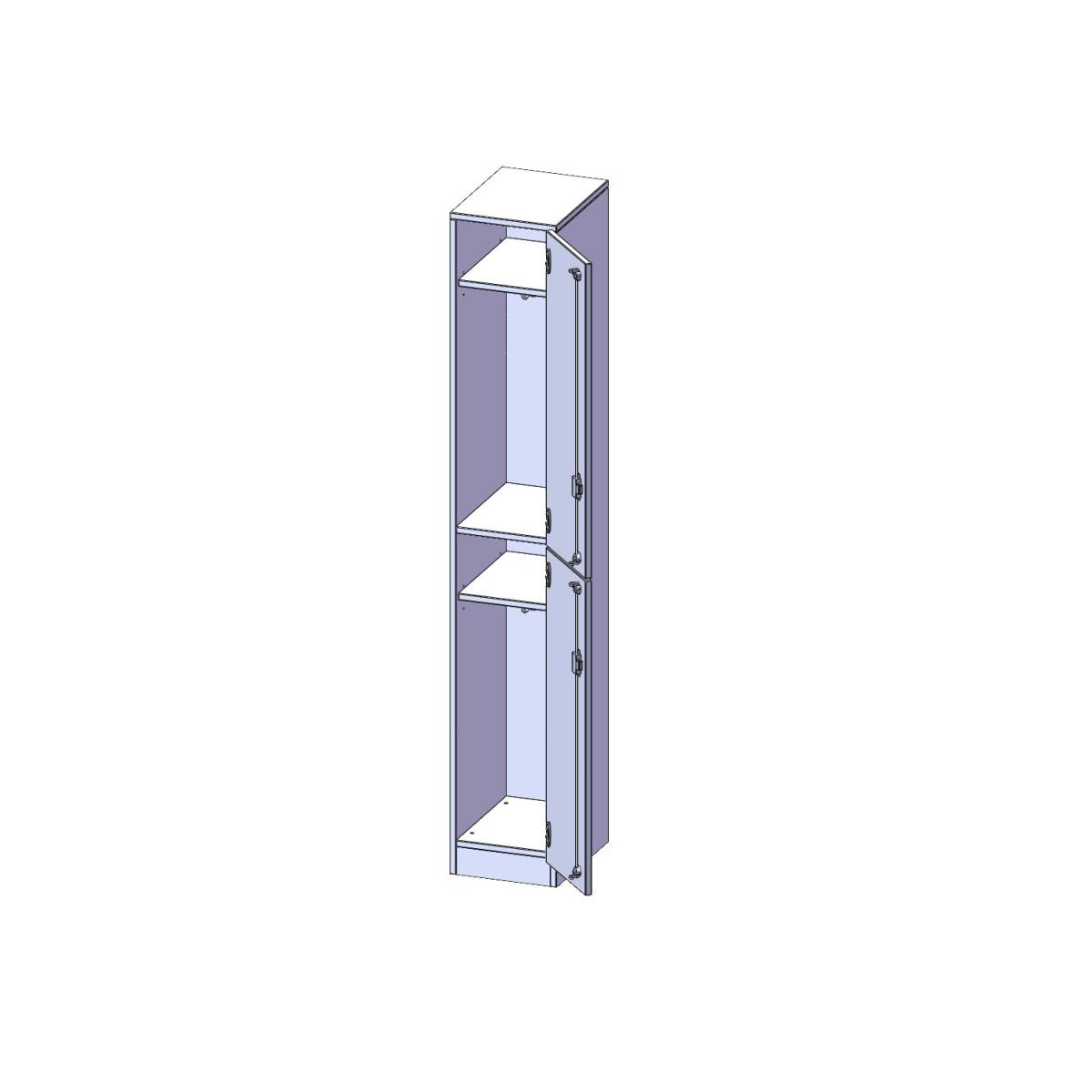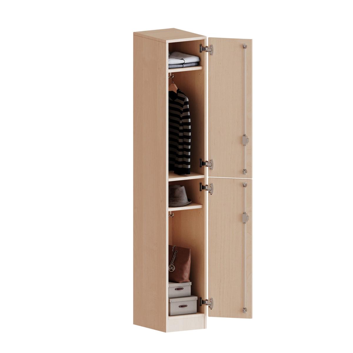 Im Inneren befinden sich eine Ablage für Mützen oder Hüte, Dreifachhaken. Ideal als Garderobeneinheiten für mehrere Schüler in Kombination mit anderen Spinden. DIe Türen sind abschließbar und öffnen 270°. Je 2 ABteile übereinander.
