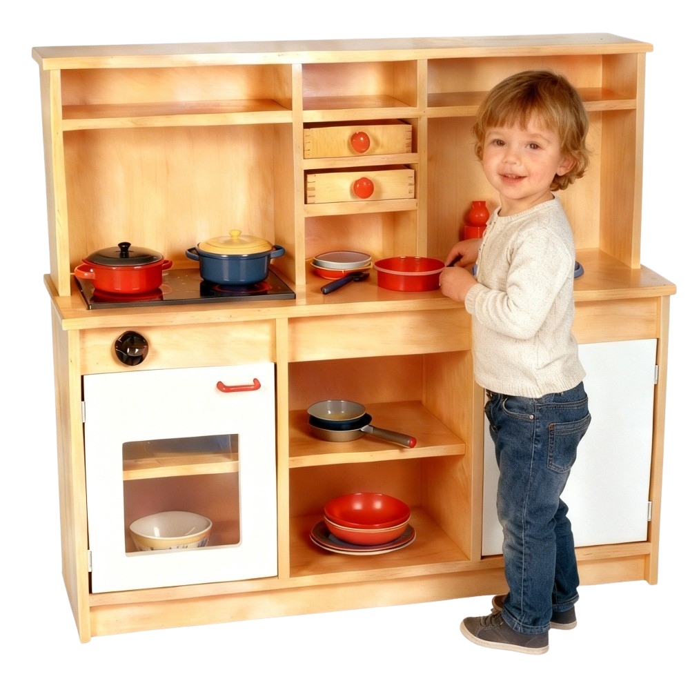 Diese liebevoll gestaltete Kinderküche vereint Spielspaß und Funktionalität in einem kompakten Möbelstück. Mit integriertem Kochfeld, Backofen und Spüle bietet sie kleinen Köchinnen und Köchen zahlreiche Möglichkeiten für kreative Rollenspiele im Kindergartenalltag. Der fest montierte Regalaufsatz mit zusätzlichen Fächern und Schüben sorgt für ausreichend Stauraum und fördert Ordnung sowie selbstständiges Spielen.