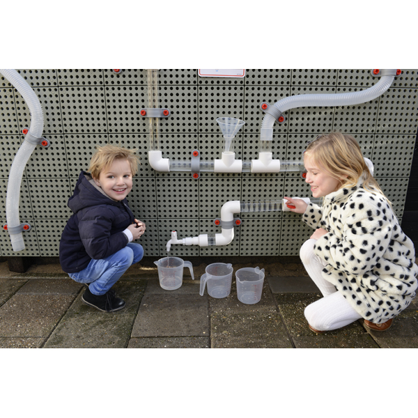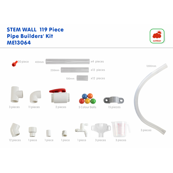 ... starre und flexible Kunststoffrohre sowie eine Auswahl an Befestigungswinkeln (mit Schraubverbindungen), Absperrventilen, Biegungen (90 und 135 Grad), T-Verbindungen, einen Wasserhahn, Ausgießbecher, Trichter und 5 bunte Bälle. Das 119-teilige Set enthält eine größere Auswahl an Teilen und ein paar zusätzliche Komponenten, um komplexere Kugelsysteme zu bauen. Hinweis: Sieh dir die Liste der einzelnen Teile unter jedem Bausatzcode an. Mit den Rohrbausätzen können Kinder coole Wasserrutschen oder Kugelbahnen bauen und diese an jeder STEM-Wand befestigen. Sie können verschiedene Strecken entwerfen, planen und bauen und dann staunen, wenn sie diese testen und anpassen, damit Wasser oder Kugeln unter der Schwerkraft nach unten fließen. Es macht großen Spaß, zu sehen, wie die Dinge durch die kristallklaren Rohre fließen, die Betten und T-Verbindungsstücke passieren - echte Technik und Ingenieurskunst in Aktion. Ventile lassen den Wasserfluss öffnen oder stoppen ihn, sodass man sehen kann, wie sich Wasser staut. Diese Sets bieten Kindern tolle Möglichkeiten, in kleinen Gruppen zu bauen, zu diskutieren und ihre Entwürfe zu verändern. Zusatzkomponente: Sehr empfehlenswert ist eine funktionierende Wasserpumpe (ME13149), die separat erworben werden kann, um das Wasser wieder an den Anfang der Bahn zu pumpen. Inhalt: 30 Schrauben, 3x 120 cm flexibler Schlauch, 4x 40 cm Röhre, 12x 25 cm Röhre, 12x 10 cm Röhre, 3x T-Stück, 11x L-Stück, 2x Absperrventil, 5 bunte Bälle, 15x Rohrschellen, 12x 45°-Stück, 1x Rohrverjüngung, 1x Hahn, 1x Trichter, 3x Messbecher.