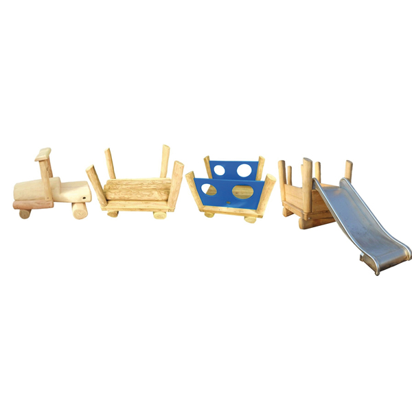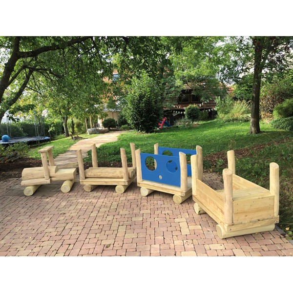 ... Diese U3-Eisenbahn aus hochwertigem Robinienholz regt Kinder nicht zum Träumen an, sie animiert auch zum Klettern und Bewegen. In ihrer Fantasie reisen die kleinen Passagiere um die halbe Welt und erleben dabei spannende Abenteuer. Ideal überall, wo mehrere Kinder gleichzeitig miteinander spielen wollen. Der Zug besteht aus: 1 Lokomotive, 1 Waggon mit PE-Seitenwänden und Gucklöchern, 1 Waggon mit Stämmen, 1 Waggon mit 2 Treppenstufen und Edelstahl-Rutsche.