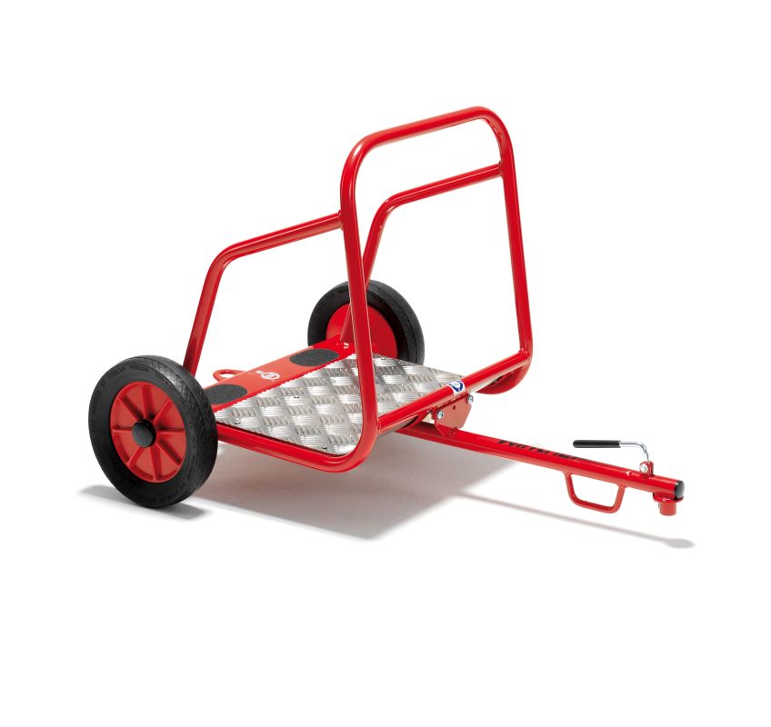 Universeller Anhänger für alle Dreiräder und Taxi-Dreiräder mit Anhängerkupplung. Leichtes An- und Auskuppeln, Sicherheitsbügel und rutschfeste Plattform. Für fantasievolle Spiele, die in der Vergangenheit, der Gegenwart oder der Zukunft spielen. Ist Ben Hur zum Mond gefahren? Mit Sicherheit - in der Spielwelt gleich nebenan.
