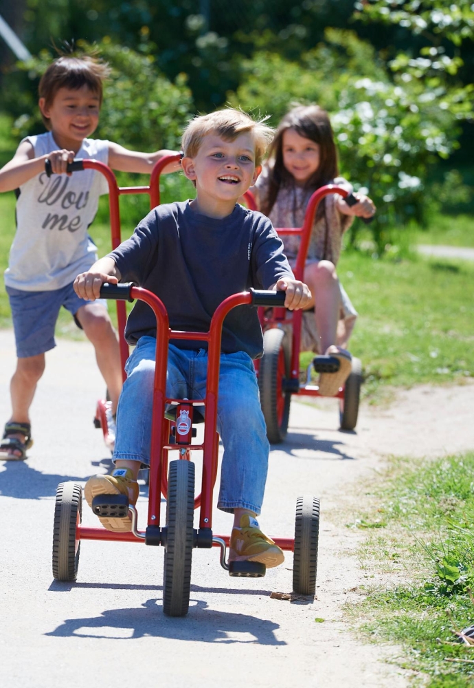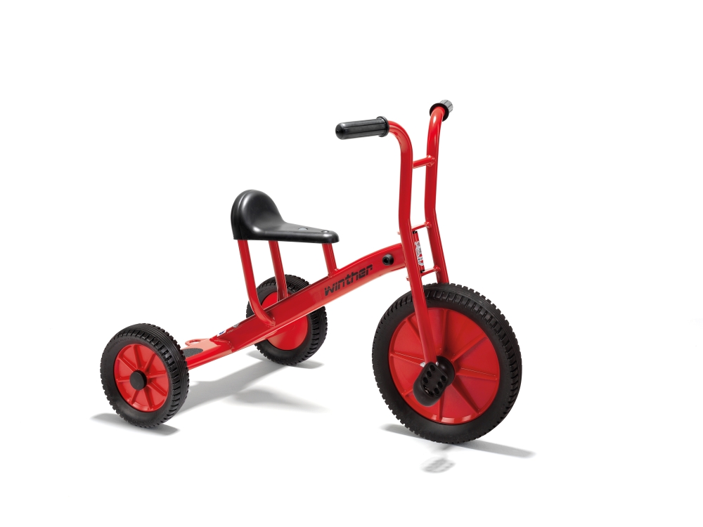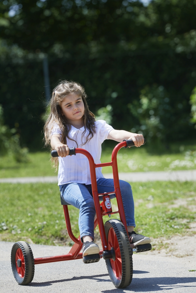 Ein klassisches Dreirad mit feststehendem Sattel für größere Kinder. Für die besondere Optik und mehr Stabilität hat dieses Fahrzeug ein extra großes Vorderrad. Zusammen mit einem Anhänger wird daraus immer ein tolles Gespann für fantasievolles Spiel!