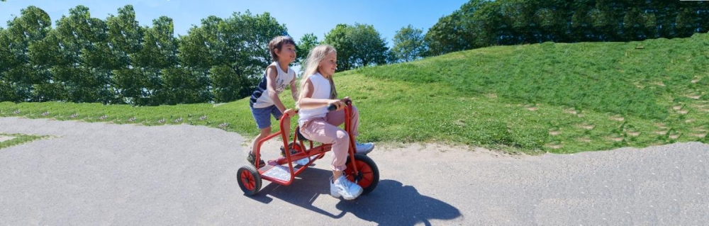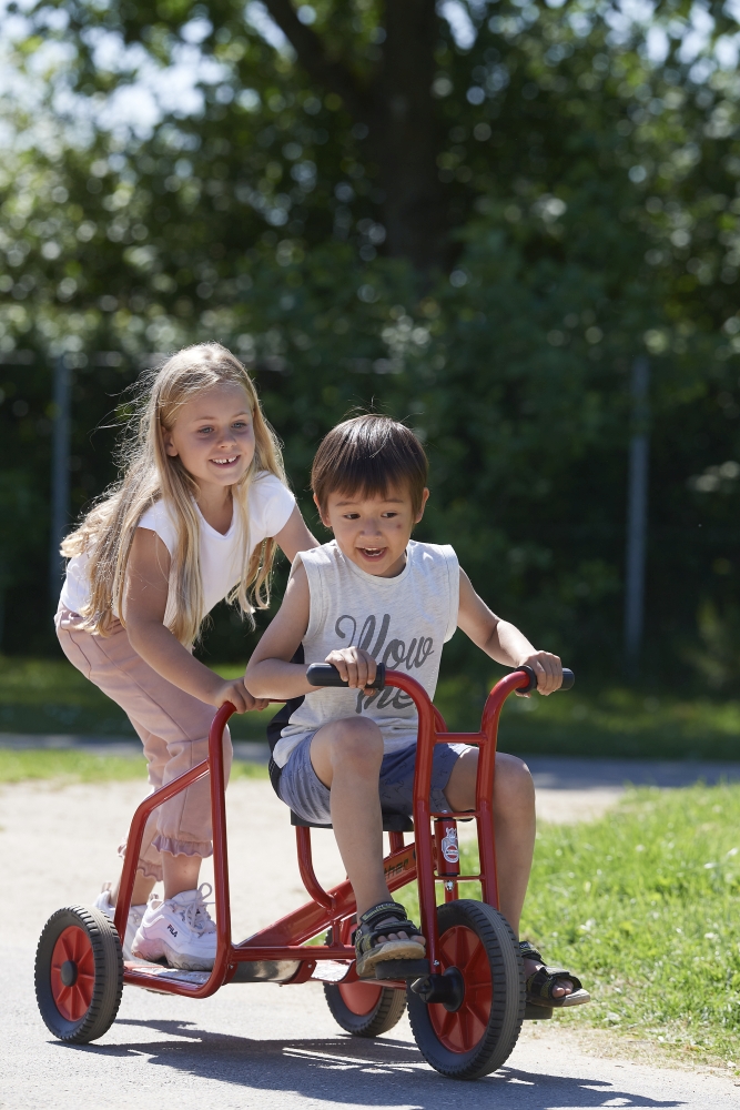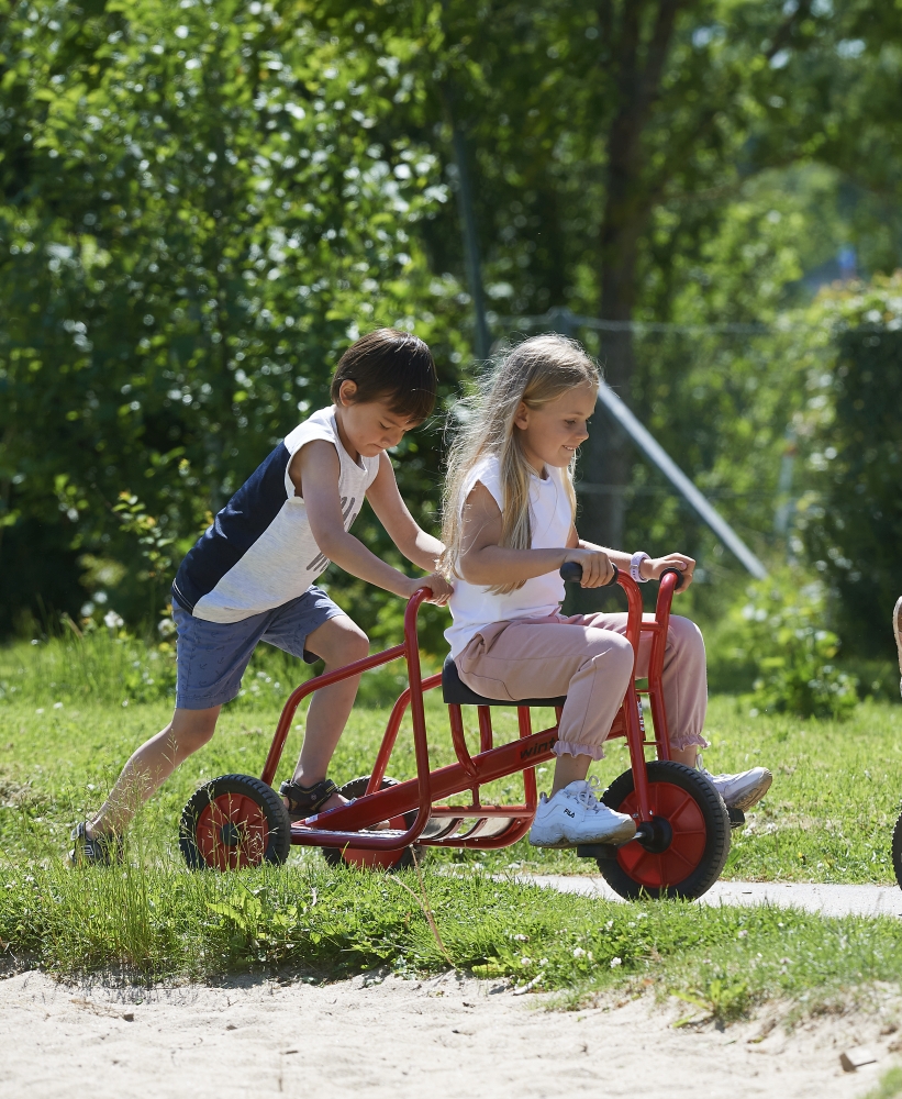 Dieses Dreirad bietet viele tolle Spielvarianten für mehrere Kinder. Die Passagiere, die stehend mitfahren, halten sich an dem Sicherheitsbügel fest. So ergeben sich zahllose Möglichkeiten und Variationen für ideenreiche Rollenspiele.