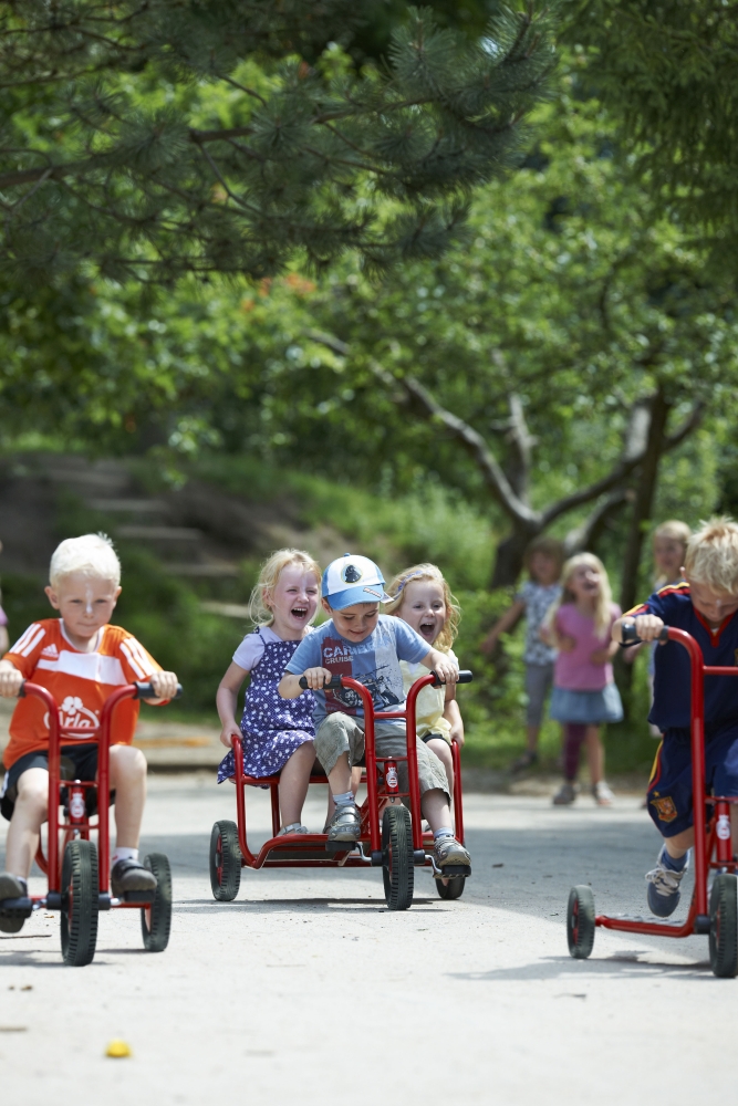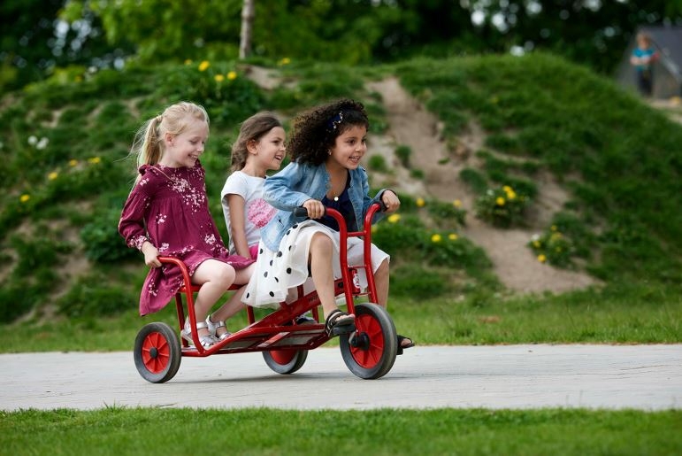 Mit dem Doppeltaxi können mehrere Kinder gleichzeitig zusammen spielen und in fantasievollen Rollenspielen auf Reisen gehen. Mit einem Anhänger wird dieses Fahrzeug noch attraktiver und vielseitiger. Auf der großen, hinteren Sitzbank kann auch ein Erwachsener sitzen und die vorderen Pedale betätigen, deshalb ist das Doppeltaxi sehr gut für den Einsatz im Therapie- oder Rehabereich geeignet.