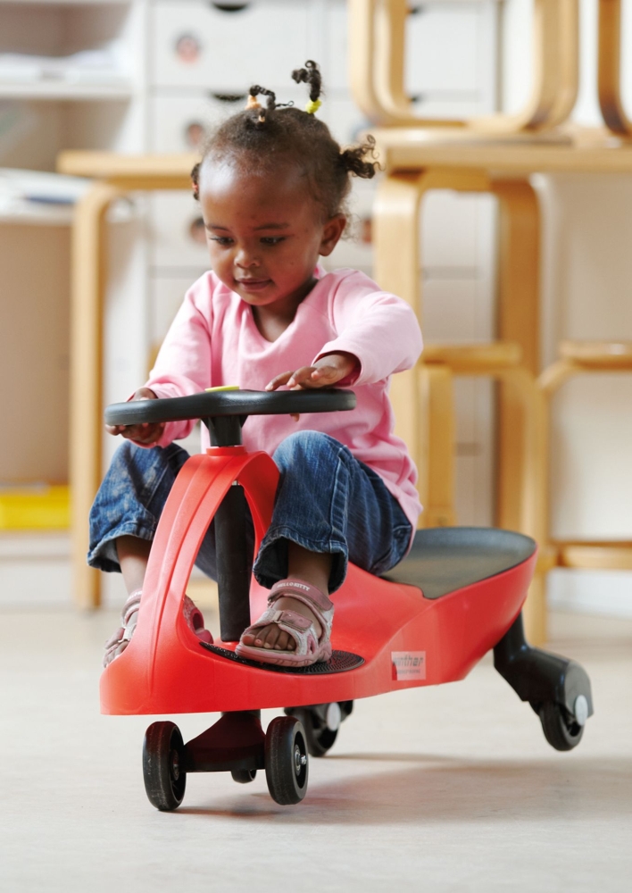 PlasmaCar • Das PlasmaCar ist ein einzigartiges Fahrzeug, das sehr viel Spaß macht, weil es eine überraschend andere Art der Fortbewegung bietet: Es bewegt sich selbständig vorwärts, wenn das Lenkrad in regelmäßigen Bewegungen von rechts nach links gedreht wird oder sogar rückwärts, wenn das Lenkrad um 180 Grad gedreht und dann bewegt wird. Kinder stellen ihre Füße auf die Fußablage, lehnen sich leicht nach vorne, umfassen das Lenkrad und setzen ihre Bewegungsenergie als Antriebskraft ein. Um zu stoppen, einfach die Füße auf den Boden setzen. Nur auf ebenen, glatten Flächen benutzen, drinnen und draußen - nicht für Holzböden geeignet. Für Kindergärten, KITAs und Kinderkrippen. Entspricht europäischen und amerikanischen Sicherheitsstandards. Stabiler, hoch-qualitativer ABS-Kunststoff, 6 Räder.