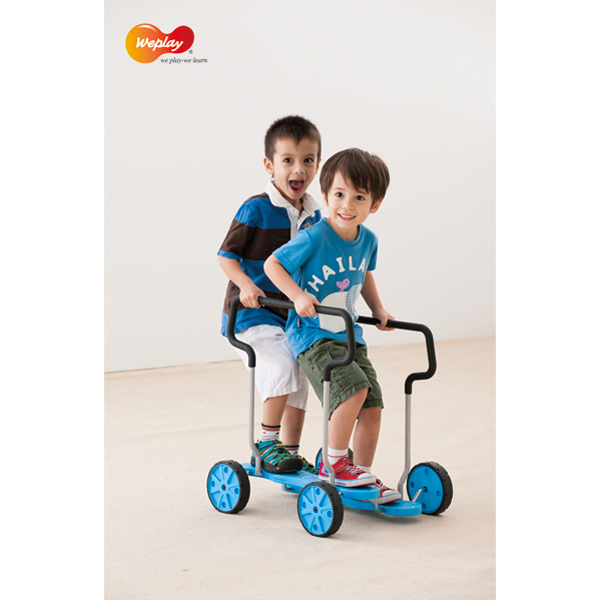 ... auf meinem neuen Weplay-Taxi! Um den Roller zu kontrollieren muss das Körpergewicht verlagert werden. Dadurch bewegt man sich nach vorne oder hinten und trainiert so das Gefühl für Balance. Dazu kommt, dass man lernt die Kontrolle zu behalten und im Team zu kooperieren, denn der Taxi Roller garantiert auch zu zweit viel Spaß. Der Roller sollte unter Aufsicht von Erwachsenen und mit Schuhen verwendet werden. Belastbarkeit: 60 kg.