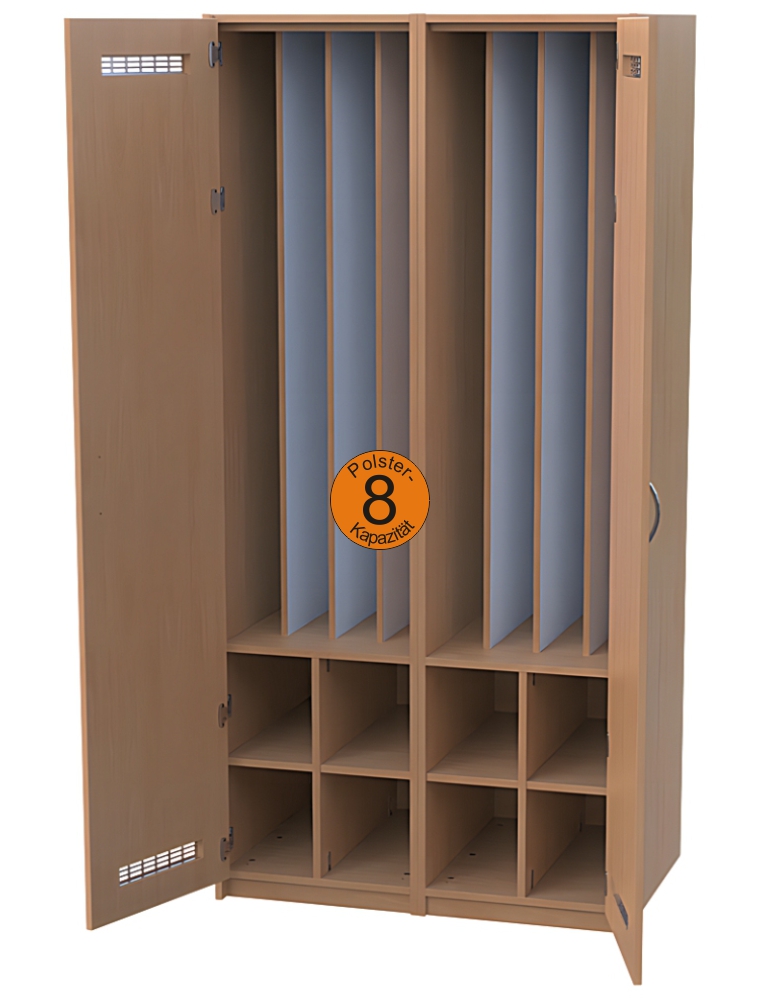 Liegepolsterschrank mit Türen mit Lüftungsgittern, Bettzeugfächer unten, für 8 Polster, B/H/T 101x210x65/71 cm