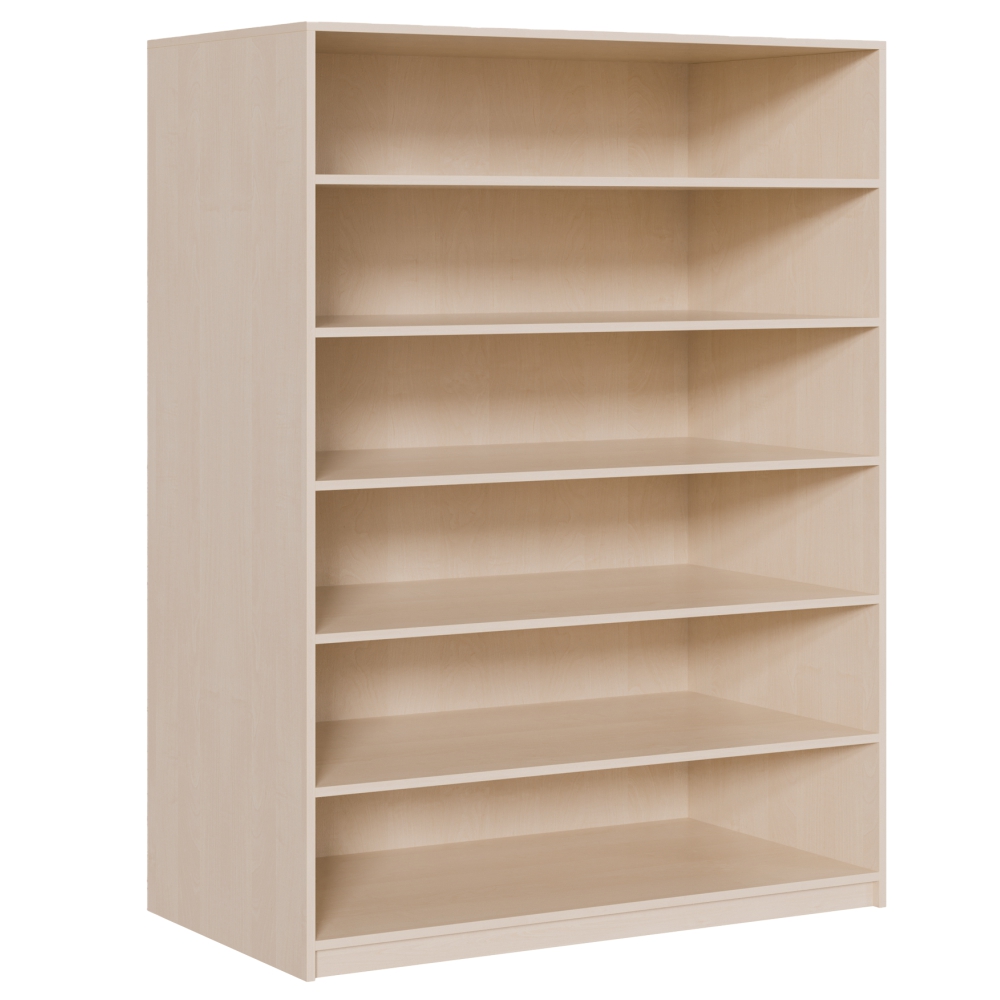 Die melaminharzbeschichteten Oberflächen sind besonders pflegeleicht und halten dem täglichen Einsatz zuverlässig stand. Eine stabile Sichtrückwand sorgt zusätzlich für sicheren Halt – ideal für lebendige Kita-Umgebungen. So bleibt alles ordentlich an seinem Platz und jederzeit griffbereit.