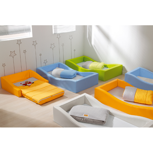 ... Das weiche Bett hat beidseitig einen niedrigen Einstieg und ist somit für die Kleinsten zugänglich, um alleine ins Bett und hinaus steigen zu können. Das Schlafen auf Bodenhöhe reduziert das Fallrisiko und gibt dem Kind Sicherheit. Die herausnehmbare Matratze ist perfekt verkeilt. Durch die Seitenform werden die Betten auch gestapelt belüftet. Der beschichtete Stoff der Matratze lässt sich feucht abwischen. Farbe: Blau.
