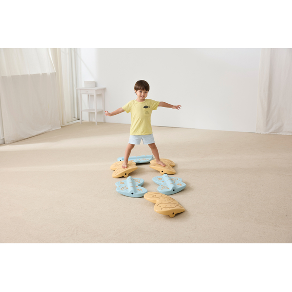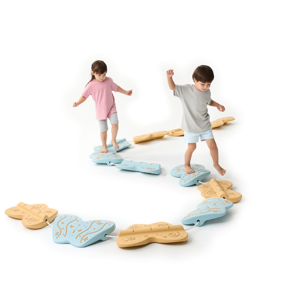 ... Die einzelnen Balancierelemente sind geformt wie Schmetterlinge. Durch die gebogene Oberfläche und die Erhebung auf der anderen Seite kann der Schwierigkeitsgrad von leicht wackelnd in wippend angepasst und so der Gleichgewichtssinn und das Reaktionsvermögen geschult und gesteigert werden. Die Schmetterlinge sind in beliebigen Abständen frei platzierbar, der Reihe nach längs und quer anordenbar oder können mit einem Seil verbunden werden. Durch den breiteren Vorderflügel und den schmaleren Hinterflügel müssen sich die Kinder auf ihre Schritte konzentrieren, während sie auf dem Pfad laufen. Dabei wird die Koordination der Arme zueinander gefördert. Das erhabene Anti-Rutsch-Muster auf Vorder- und Rückseite stimuliert den Tastsinn und sorgt für Sicherheit beim Balancieren. Set: 6 Schmetterlinge, 1 Seil. Belastbar bis 60 kg.