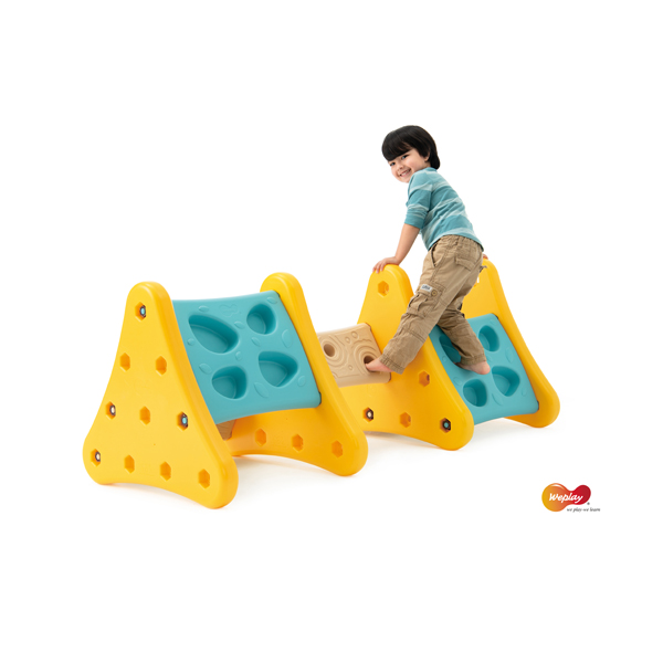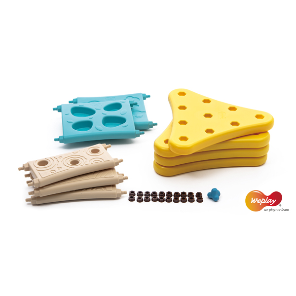... Die breiten und schmalen Bretter haben auf beiden Seiten verschiedene Strukturen, die den Tastsinn der Kinder anregen. Vertiefungen in den breiten und schmalen Brettern geben den Kindern Halt beim Klettern mit Händen und Füßen. Die schmalen und breiten Bauteile werden mit den dreieckigen ganz einfach und fest mittels Schraubenmuttern verbunden. Durch unterschiedliche Aufstellmöglichkeiten, z. B. als Treppe kann der Schwierigkeitsgrad variiert werden. Das Klettern fördert die Muskelkraft und die Balance der Kinder. Inhalt: 4 x Dreieck (gelb), 3 x breites Brett (türkis), 2 x schmales Brett (ocker), 20 x Schraubenmutter, 1 x Schraubenschlüssel aus Kunststoff. Max. belastbar bis 60 kg.