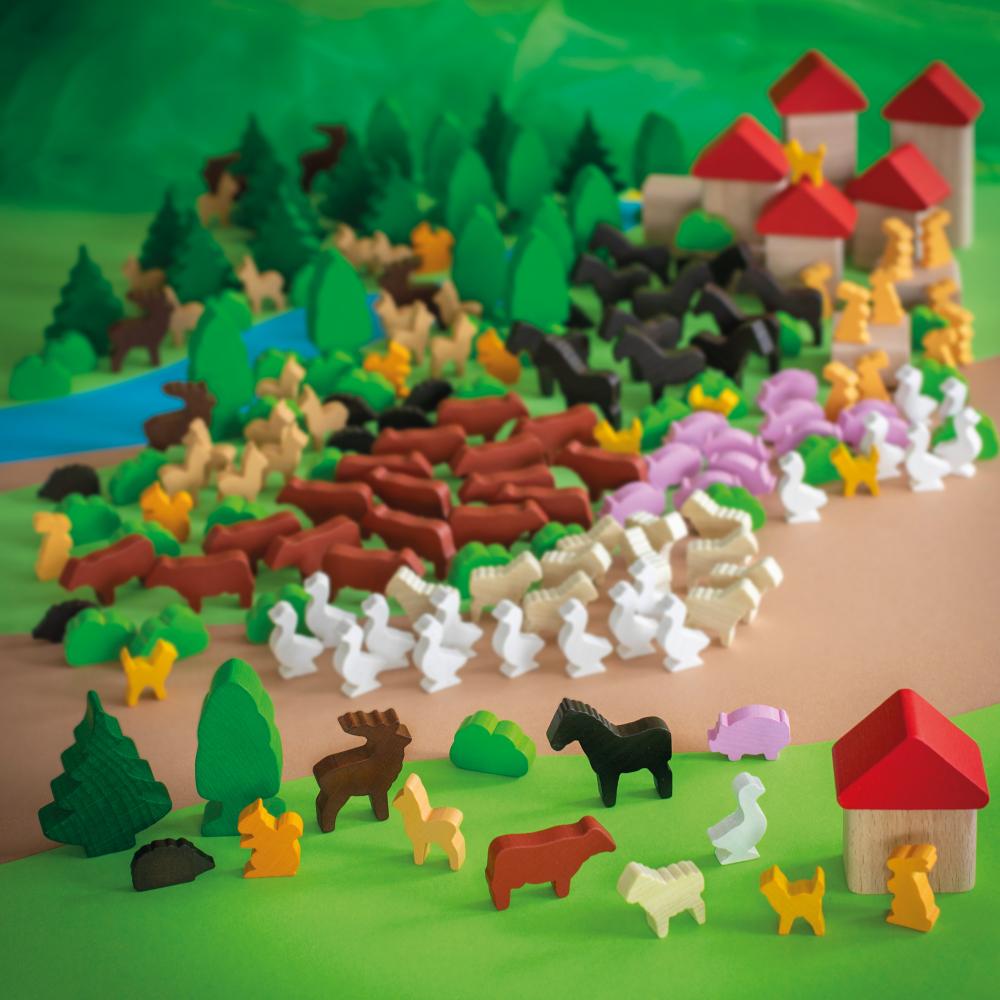 12 Häuser, 6 Dächer, 12 Nadelbäume, 12 Laubbäume, 6 Hirsche, 18 Rehe, 18 Kühe, 12 Pferde, 12 Schweine, 12 Schafe, 6 Katzen, 12 Kaninchen, 18 Gänse, 8 Igel, 6 Eichhörnchen, 30 Büsche