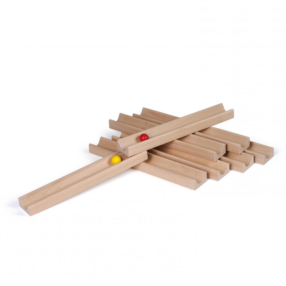 Mit diesen robusten Holzkugelbahnen werden Gruppen zu Teams! Beim gemeinsamen Spiel arbeiten alle Mitspieler Hand in Hand und bauen eine lange Bahn. Ziel ist es, die Holzkugeln ständig in der Rollbewegung zu halten und so nacheinander von einem Punkt zum anderen zu transportieren. Geschicklichkeit, Konzentration, Reaktion und Abstimmung sind hier Pflicht, damit die Kugel nicht auf den Boden fällt. Verschiedene Schwierigkeitsstufen sind durch Reduzierung der Bahnen möglich, ebenso könnten zwei Teams gegeneinander spielen.