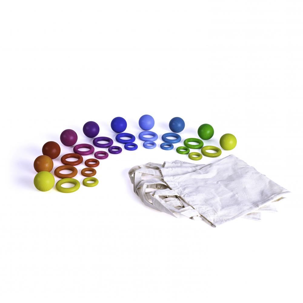 10 Holzkugeln (Ø 50 mm), 10 Holzringe (Ø 60 mm), 10 Holzringe n (Ø 40 mm), 4 Stoffbeutel
