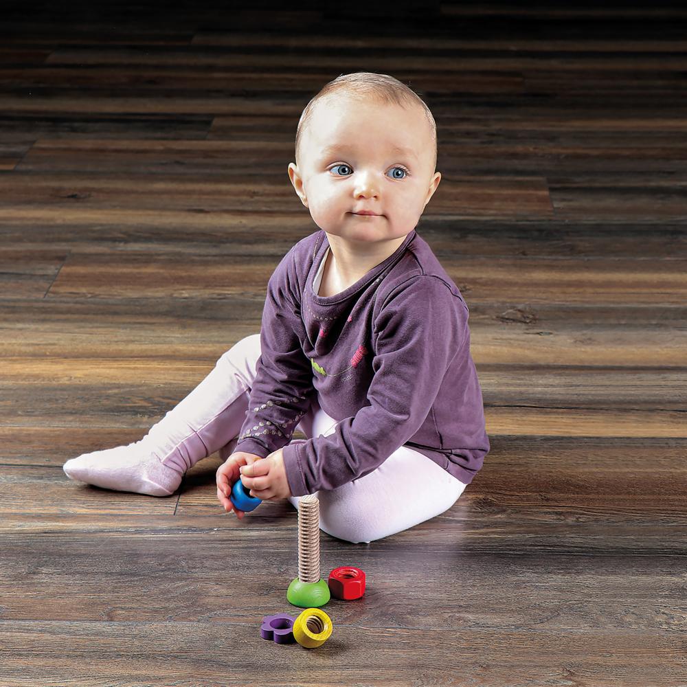 Kleine Finger und Hände werden das niedliche, bunte Schraubenspiel gar nicht mehr loslassen. Der untere Knopf ist fest mit dem Gewinde verbunden, damit die Kleinen alles gut im Griff haben. Das lila Blümchen ist zum Aufstecken. Die vier anderen Teile sind zum Auf- und Abschrauben. Bunter Spielspaß ohne Ende.