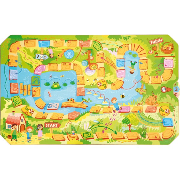 ... Mit einer wunderschön illustrierten Landschaft steht der Tisch bereit zum 'Pilze sammeln' für bis zu 6 Kinder. Los geht es mit leeren Körben am Haus, durch den Garten und über den Fluss. Ein Drehrad mit Zahlen von 1 bis 6 an der kurzen Tischseite ersetzt den Spielwürfel. Je nach Zahl ergeben sich die Leiterspiel-typischen Abkürzungen und Umwege. Als Spielfiguren dient, was gerade parat ist.