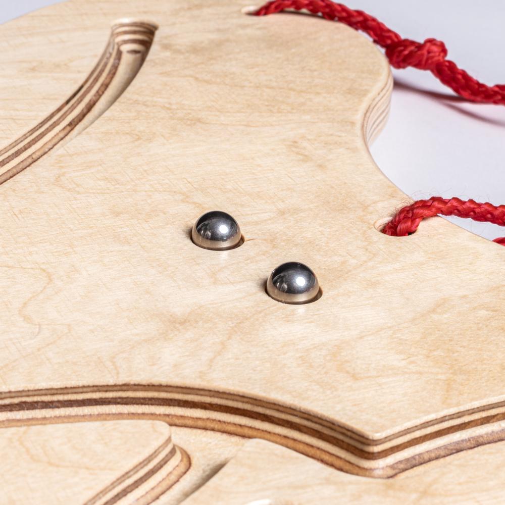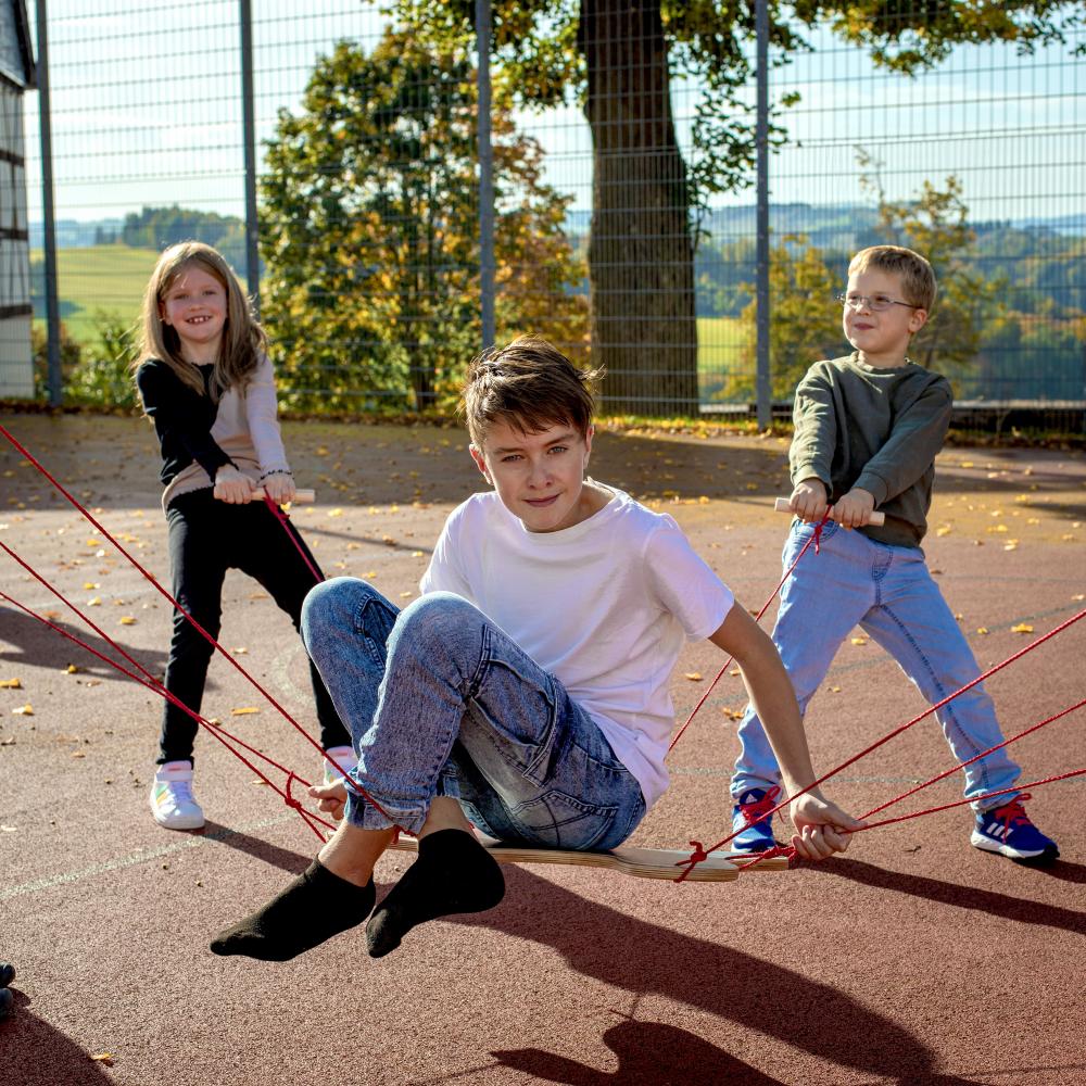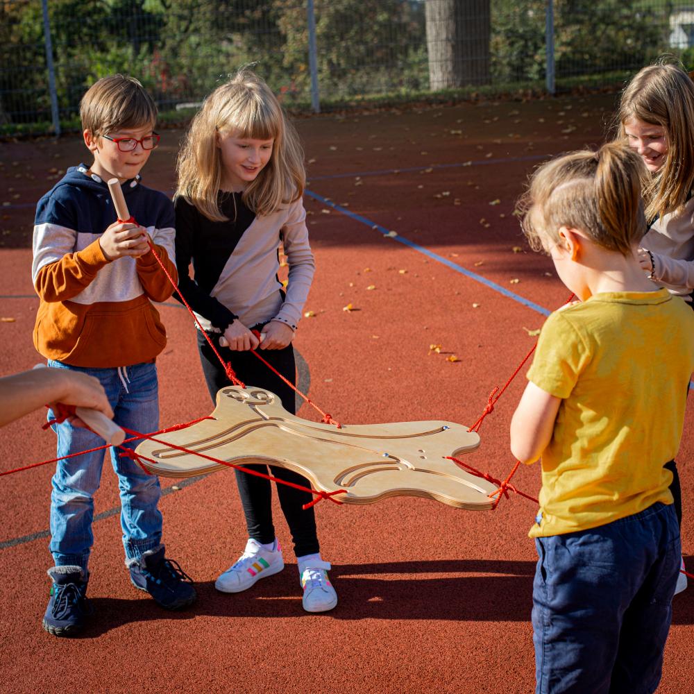 Unser Balancespiel "Teamgeist" ist eine von 2 Seiten bespielbare Birkensperrholzplatte, die durch Zug an den angebrachten Schnüren bewegt und gesteuert werden kann. Die 2 - 9 Mitspieler üben hier spielerisch Zusammenarbeit, Koordination und Kooperation. Auf einer Seite unseres Teamgeistes befindet sich eine eingefräste Spur, durch die die 2 mitgelieferten Stahlkugeln sausen, wenn alle Mitspieler am richtigen Strang ziehen.