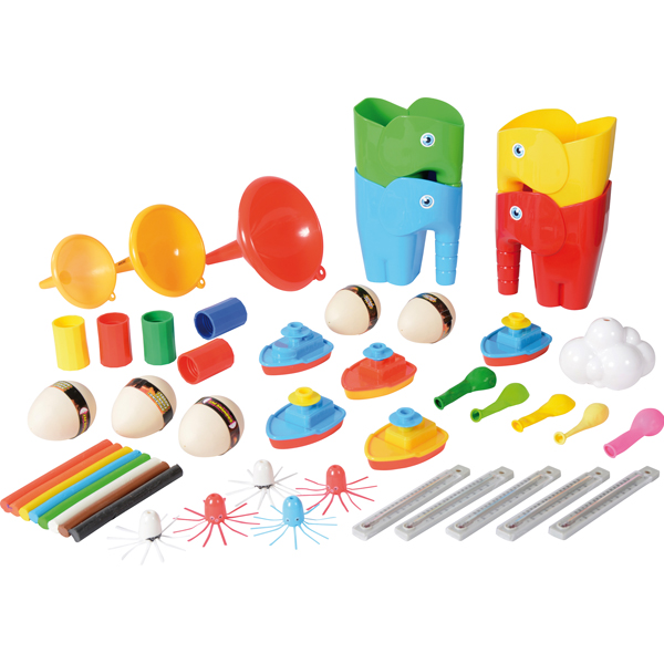 ... Eingießen, umfüllen, Boote fahren lassen, Regen erzeugen, Temperaturen messen, Tiere schlüpfen lassen... Mit diesem Set und Wasser können sich Kinder stundenlang sinnvoll beschäftigen und mit Spaß durch eigene Erfahrungen lernen. Das Set wird in einer transparenten 15 Liter Kunststoffkiste mit Deckel geliefert. Enthalten sind: 3 Trichter, 4 Elefantenschaufeln, 5 wachsende Eier mit Tier, 5 Thermometer, Knetmasse in 8 Farben, 5 Flaschenkraken, 5 Flaschentornados, 1 Pluï Rain Cloud, 5 Ballon Boote.