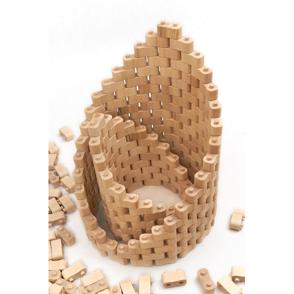 ... Was kann man aus nur einer Sorte Steinen bauen? Jede Menge, denn durch die zwei runden Zapfen und abgerundete Enden können die Holzbausteine in jedem Winkel miteinander verbunden werden. Neben rechteckigen sind auch runde und geschwungene Formen möglich. Das erlaubt der Fantasie, viele kreative Ideen zu entwickeln und umzusetzen. Die Bausteine lassen sich leicht zusammenstecken und sind somit auch für jüngere Kinder geeignet, deren motorische Fähigkeiten sich entwickeln sollen.