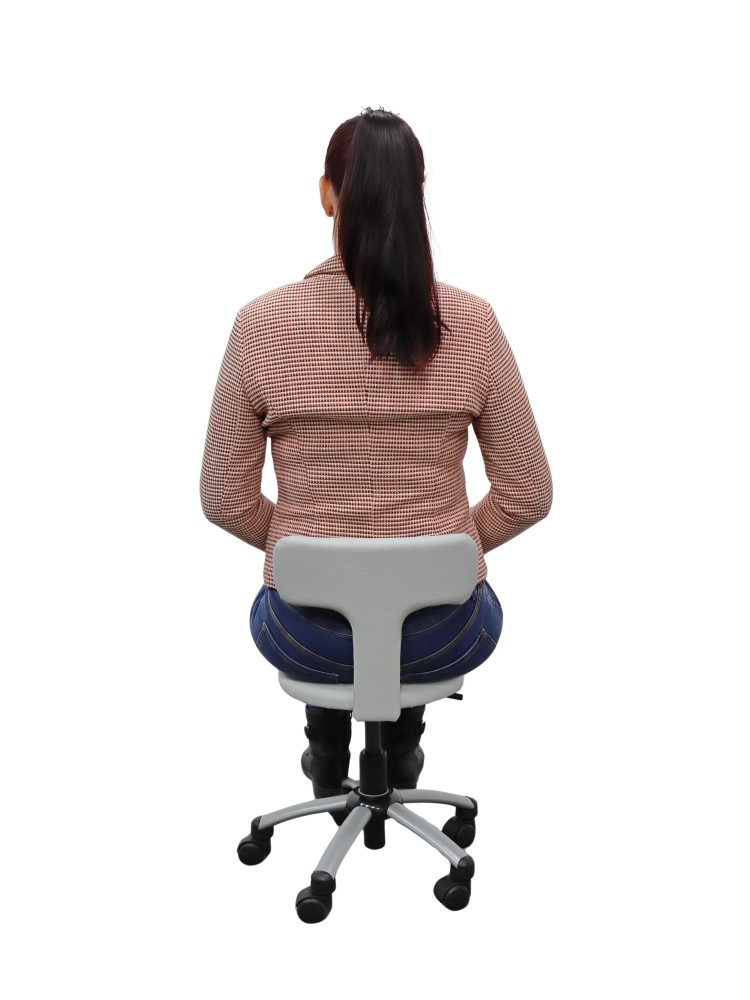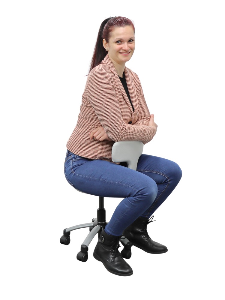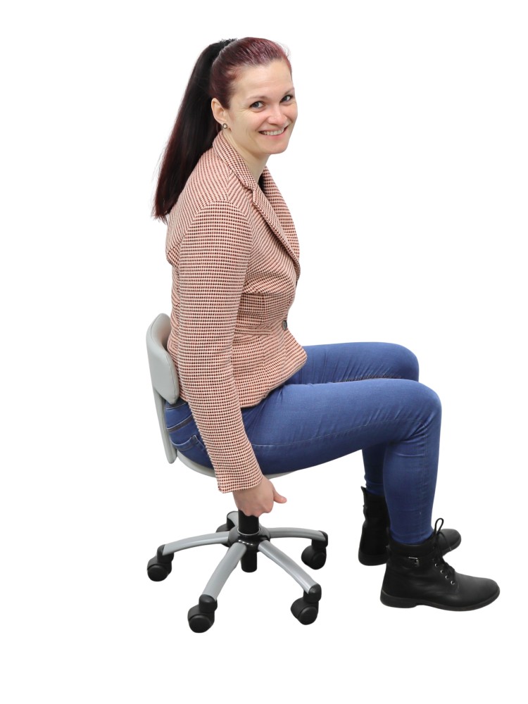 Die Sitzhöhe ist stufenlos verstellbar im Bereich 34 - 44 cm. Somit ist auch für unser 1,77 m großes Fotomodel eine geeignete Sitzhöhe dabei. Das kompakte Fußkreuz mit 42* cm Durchmesser ermöglicht einen großen Aktionsradius.