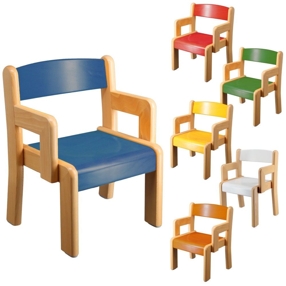 Der farbenfrohe Holzstuhl für Kita, Krippe oder Vorschule überzeugt durch sechs wählbare Farbmöglichkeiten, großzügige Rückenlehne und ergonomische Sitzfläche aus robustem Buchensperrholz. Das Gestell aus massiver Buche ist dank Trapezzinkenverleimung besonders stabil, während nach hinten ausgestellte Hinterbeine für Kippsicherheit sorgen. Die gerundete Vorderkante beugt Blutstau in der Kniekehle vor und die Armlehnen sorgen für extra Halt beim sitzen.