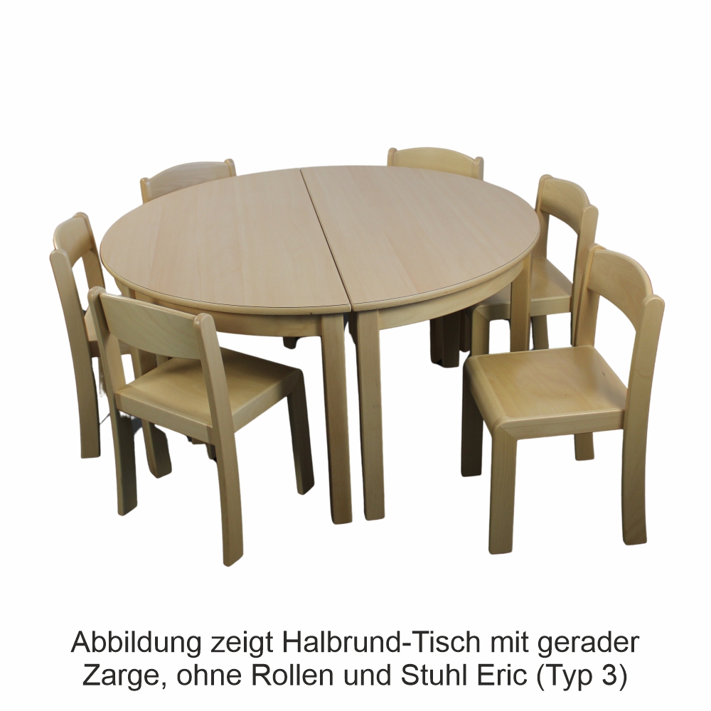 Der Halbrund-Tisch 120 x 60 cm ist stabil, sicher und für den täglichen Einsatz im Kindergarten gemacht. Die robuste HPL-Tischplatte in Buche natur ist kratzfest, pflegeleicht und 19 mm stark. Gestell und Beine aus massivem Buchenholz (48 x 48 mm), farblos lackiert, geben dem Tisch seine natürliche Ausstrahlung und lange Haltbarkeit. Sanft gerundete Kanten sorgen für Sicherheit im Gruppenalltag. Erhältlich in Tischhöhen von 36 bis 76 cm sowie in vier Ausführungen – mit gerader oder geschweifter Zarge, jeweils mit oder ohne Rollen – passt dieser Tisch in jede Einrichtung.